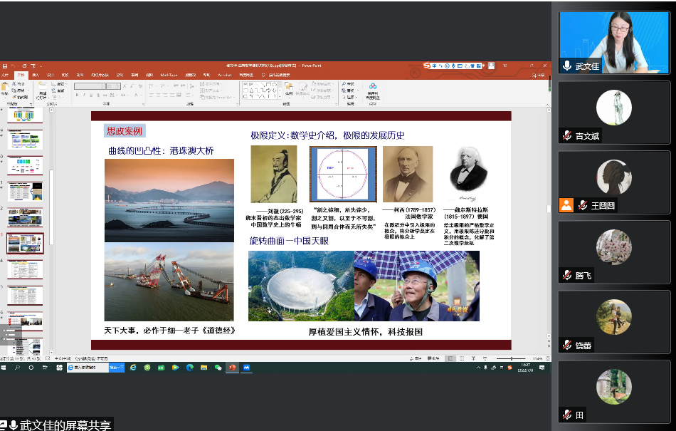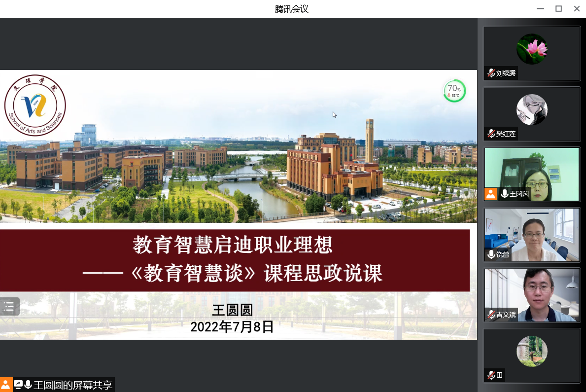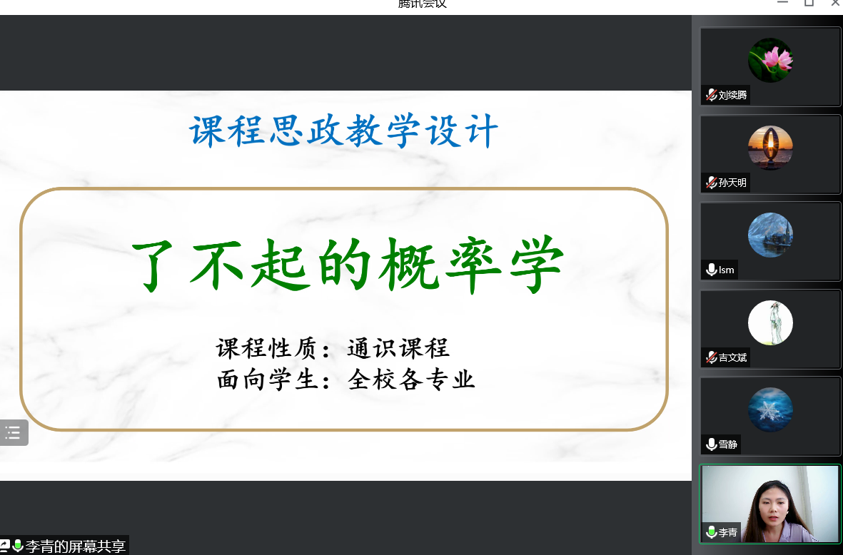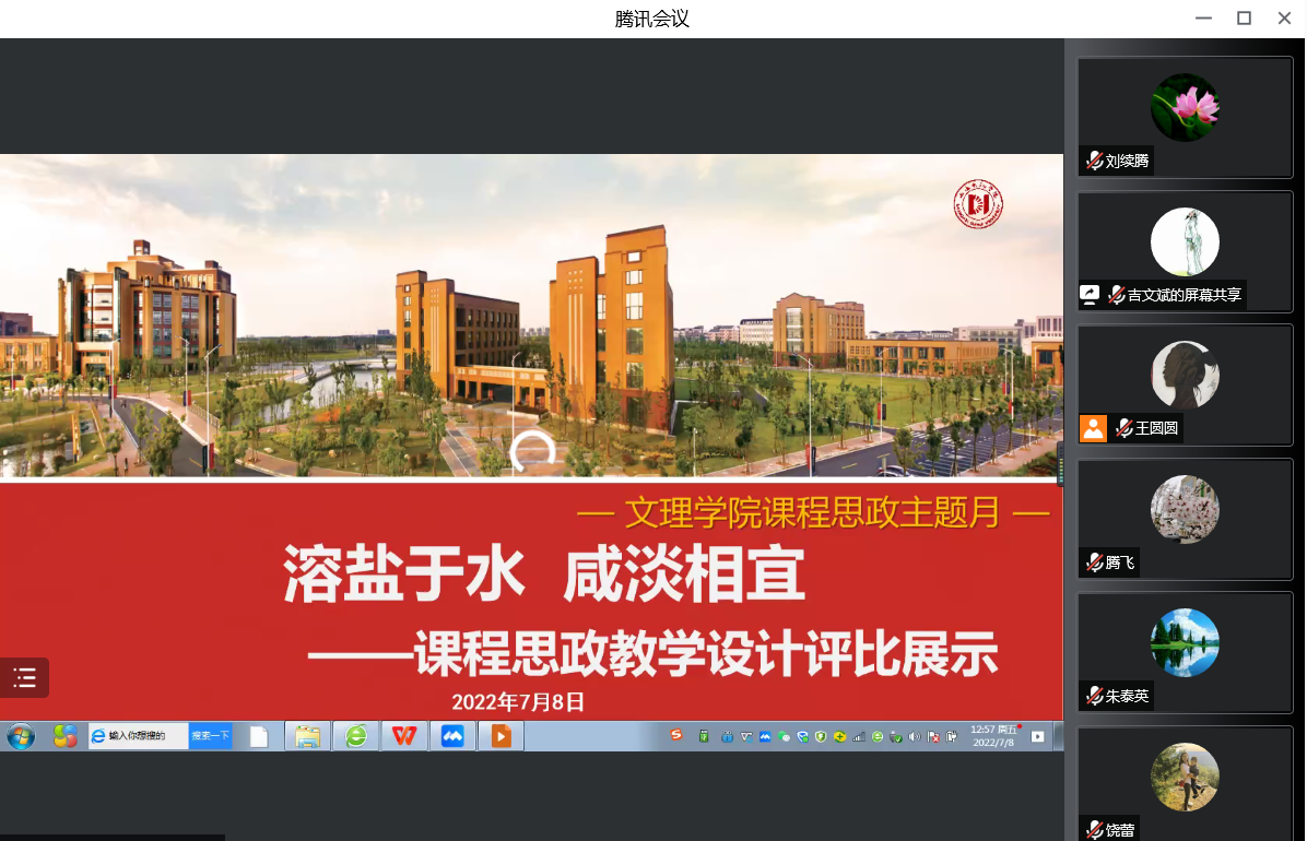 为进一步落实立德树人根本任务,充分发挥课堂教学育人的主渠道、主阵地作用,促进基础课程教育与思政教学有机融合,自6月初以来,pp电子游戏官网顺利开展“课程思政主题月”活动。7月8日,主题月收官活动——“pp电子游戏官网课程思政教学设计评比展示”以线上方式举行,特邀学校党委办公室主任、首批校级课程思政教学团队负责人董雪静,教务处副处长饶蕾,资深教授刘三明担任评委,pp电子游戏官网院长朱泰英、直属党支部书记康秀珠、全院教师及兄弟学院相关教师参加本次活动,活动由副院长吉文斌主持。