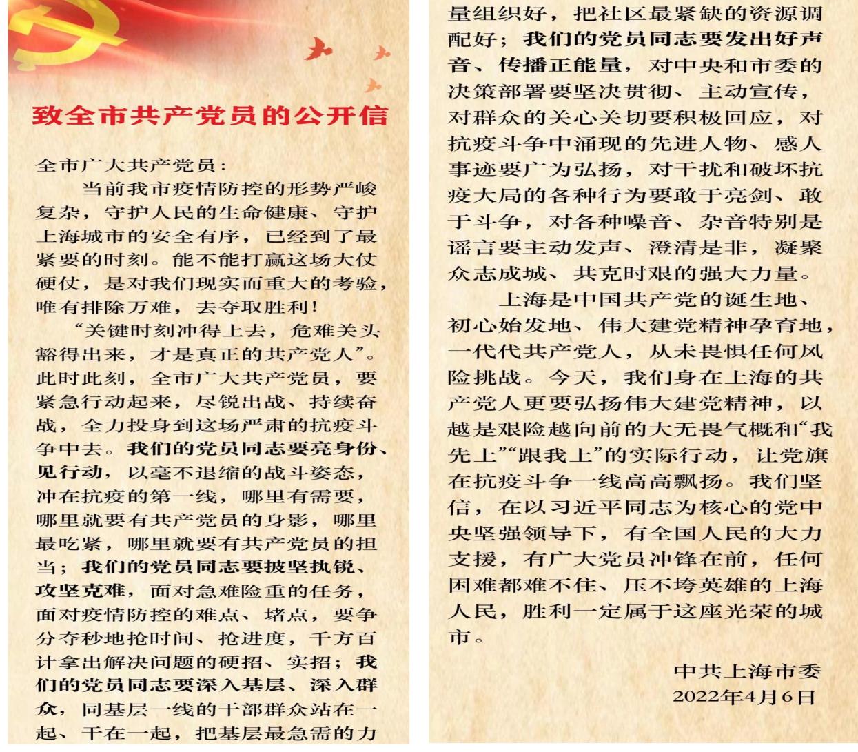 在疫情正吃紧的关键时刻,党员们收到上海市委《致全市共产党员的公开信》。结合学校疫情防控工作实际,康秀珠号召全体党员教师充分发挥党员的先锋模范带头作用,扛起特殊责任,拿出特殊担当,号召校外党员同志主动下沉社区抗疫一线,接受居村党组织统一指挥,与基层干部群众并肩作战,当先锋,做表率;学院专班教师要继续提高战斗意识,保证学院线上线下工作的正常运行;校内专班党员教师继续发扬先锋模范作用和奉献精神,继续参与学生园区网格化管理,深入学生园区加强学生园区网格化管理力量,真正把学校各项防控措施落细落实,共同筑牢学校疫情防护的“铁壁铜墙”。
