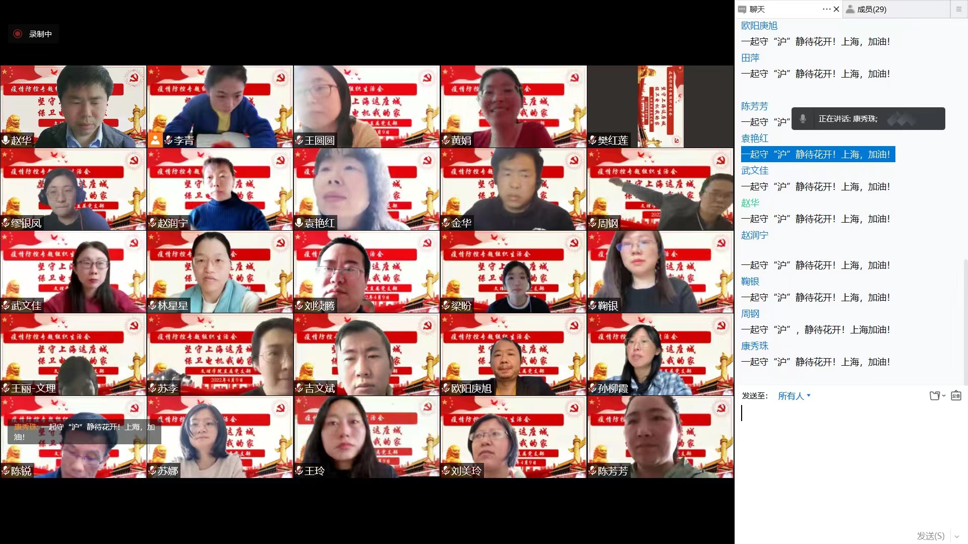 随后,康秀珠对支部党员老师们的日常生活与工作情况进行了排摸,并重点对情况特殊的党员教师表示了关心和问候。党员老师也都纷纷敞开心扉,彼此进行了交流,互相表达了关心与想念。党员教师们认真落实“双报到”通知要求,在做好线上教学的同时,积极参加社区抗疫志愿活动。大家纷纷交流了自己做志愿者时的感受。有的党员家中上有年迈的老人,下有还在咿呀学语的儿女,在社区防护措施不足,阳性病例持续增长的情况下,仍然坚守志愿者岗位;有的党员起早贪黑,不辞辛苦地坚持给社区每家每户送物资;有的党员在自己腰伤还没有痊愈的情况下,坚持参与社区货物的搬运与发放;校内专班的党员教师也始终坚守学校抗疫一线,守土担责、守土尽责,24小时随时待命,行动如闪电,运转如机器。
