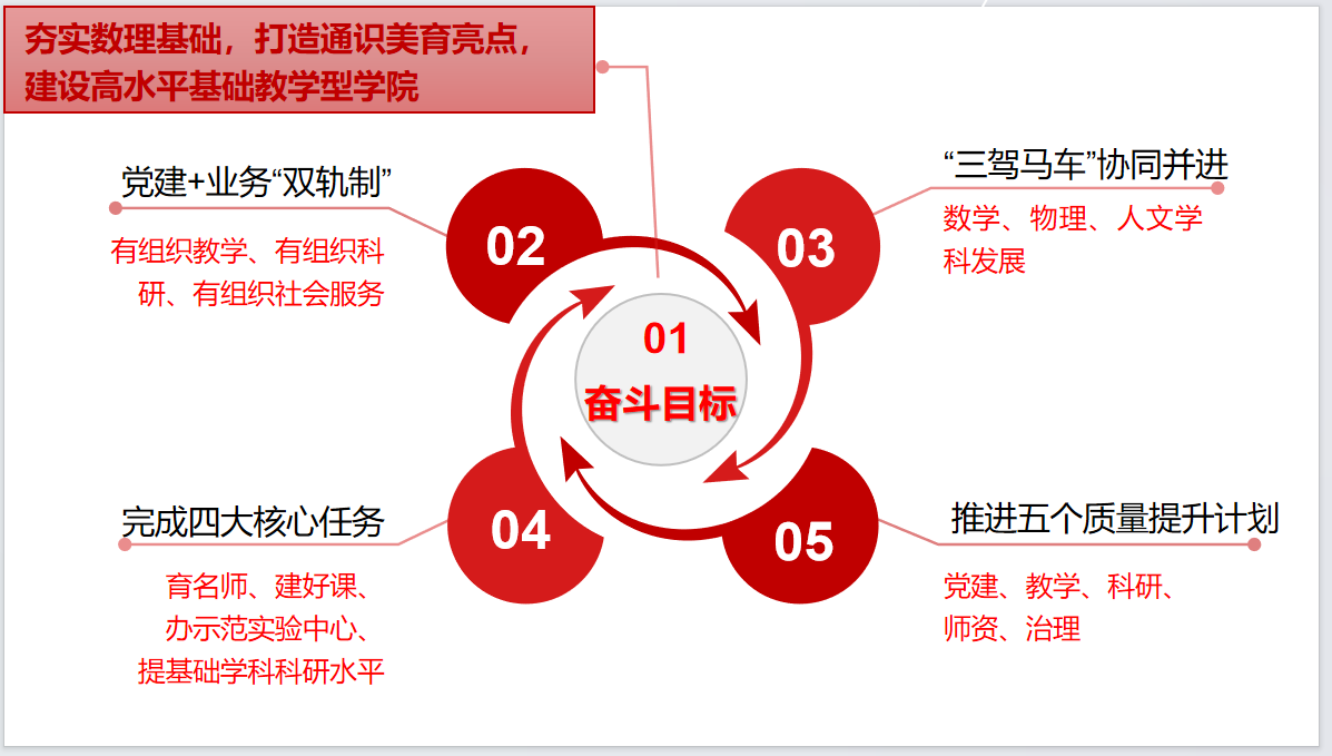 副院长吉文斌对暑期教改调研工作做了总结,并对开学阶段教学工作做了布置。他结合学院班子的主题教育调研成果,作了题为“如何加强高水平基础教学型学院建设的思考”的报告。报告深入分析pp电子游戏官网在建设高水平基础教学型学院过程中的痛点问题、难点问题、弱点问题、堵点问题等,根据学院班子在主题教育期间的调研成果,提出“12345”的学院建设思路:“1”是实现一个奋斗目标,即夯实数理基础,打造通识美育亮点,建设高水平基础教学型学院;“2”是推进“党建+业务”的“双轨制”建设,促进有组织教学、有组织科研、有组织社会服务;“3”是“三驾马车”协同并进,推进数学、物理、人文三个学科高质量发展;“4”是落实四大核心任务,即做好育名师、建好课、办示范实验中心、提基础学科科研水平等四方面重点工作;“5”是实施五个质量提升计划,即党建质量提升计划、教育教学质量提升计划、科研水平提升计划、师资队伍提升计划、治理能力提升计划。吉文斌指出,pp电子游戏官网正处在推进高质量发展的重要机遇期,全体文理人要继续弘扬务实的文理之风,努力办好开放的pp电子游戏官网,齐心走出奋进的文理之路,为创造pp电子游戏官网更美好的明天而协同努力!