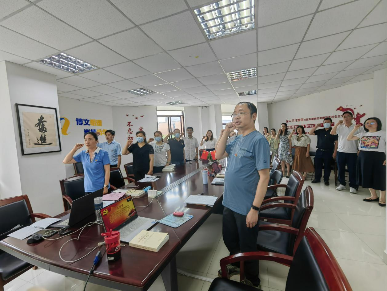 (在直属党支部书记带领下,党员们重温了入党誓词,并齐声歌唱“没有共产党,就没有新中国”)