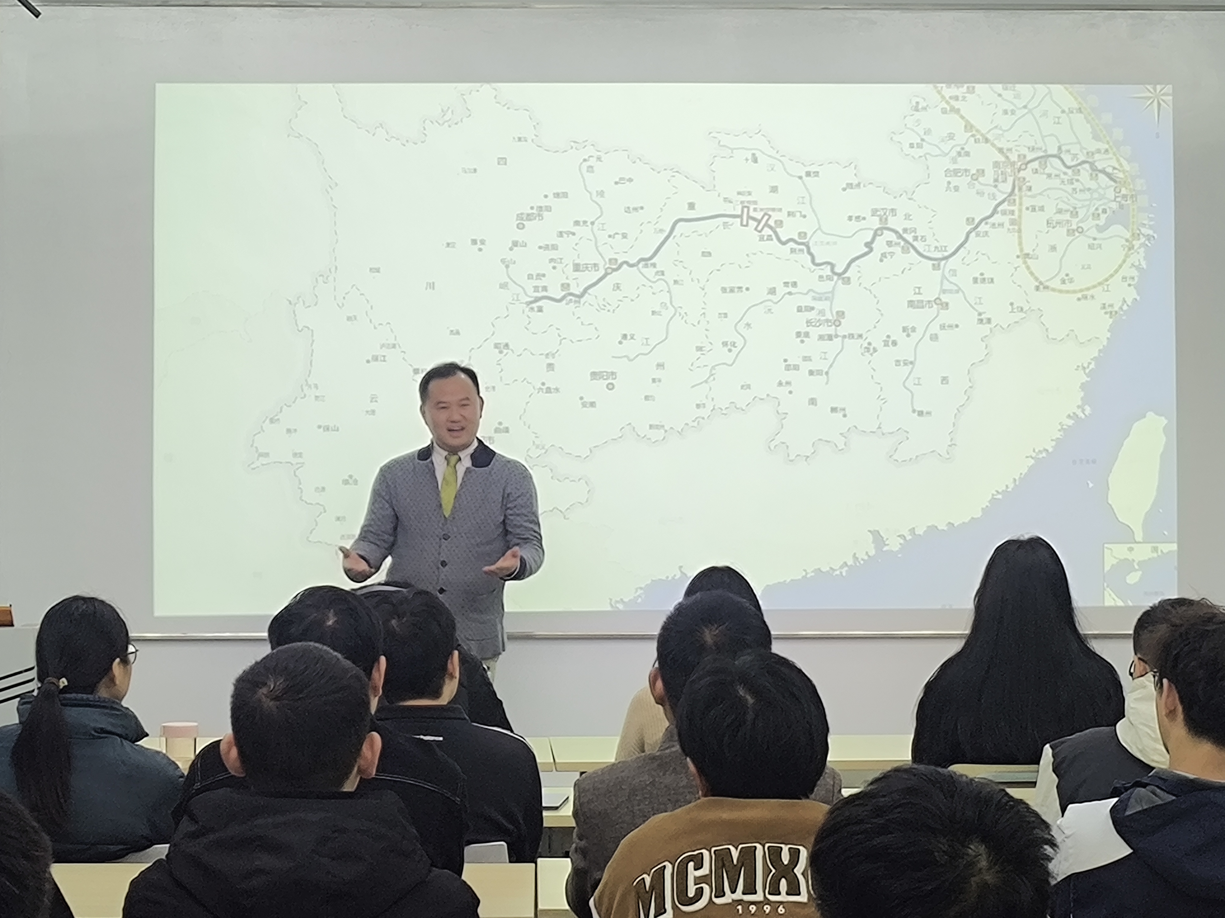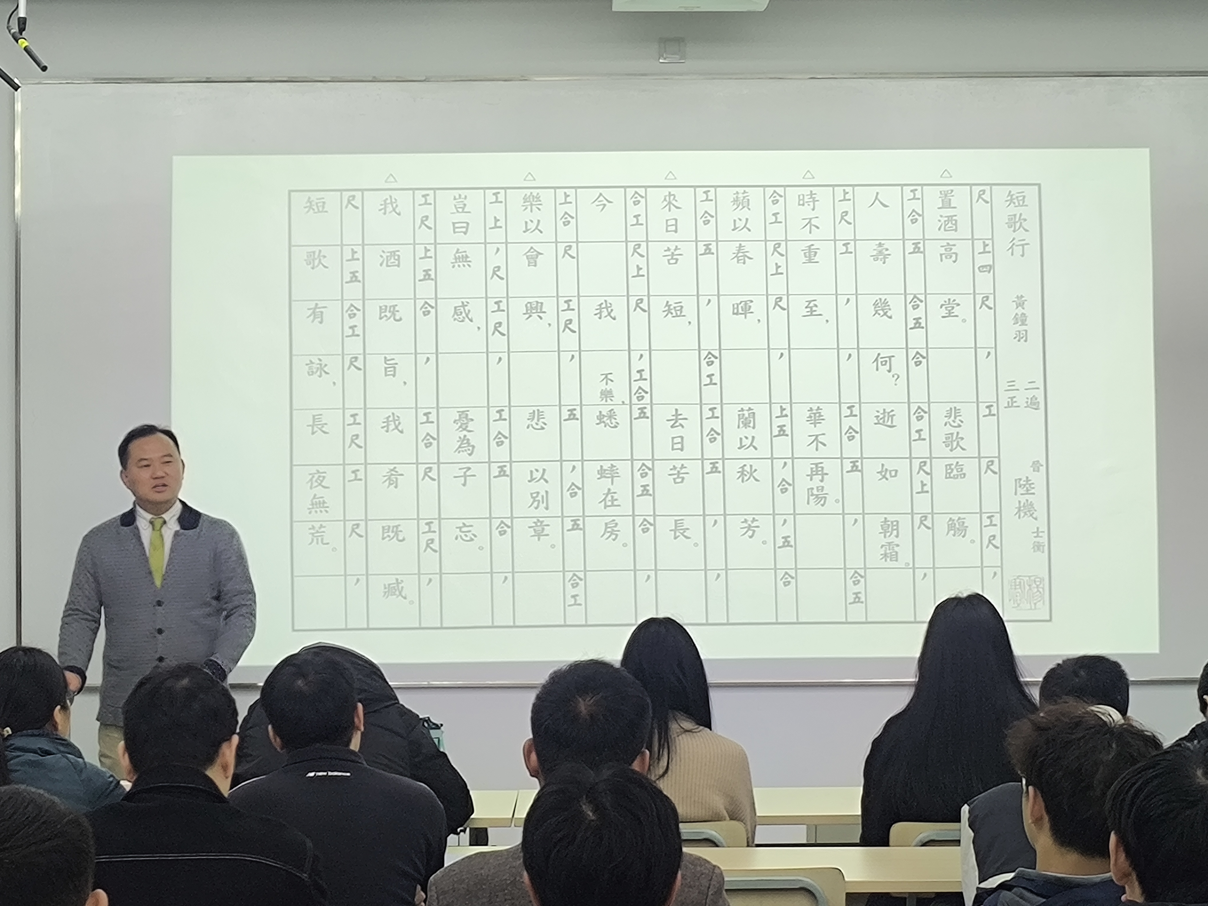 讲座始伊,杨赛老师以习近平新时代中国特色社会主义思想为核心,论述了文化对于一个国家、一个民族的重要作用与价值,其中江南歌诗与文化又是中国传统优秀文化的重要组成部分。杨赛老师紧接着从南京文化特色、江南的特点出发,长江为线、由东向西、遍及两岸,以范仲淹、欧阳修、苏轼等著名诗人为代表关联解读,不仅让同学们对中国传统文化中的歌诗有了更深层、更直接的了解,还阐释了对推动当代长江文化带建构、长三角一体化的积极作用。之后,杨老师通过对《桃叶歌》《虞美人》《长相思》等多首古谱诗词的解读、教唱,让从未接触过工尺谱的同学们了解了千年前的中国古代记谱法,用工尺谱记载的古谱诗词将汉语言的声音和意义充分融合,达到了语感、情感、乐感、美感的完美统一,具有极高的艺术价值。