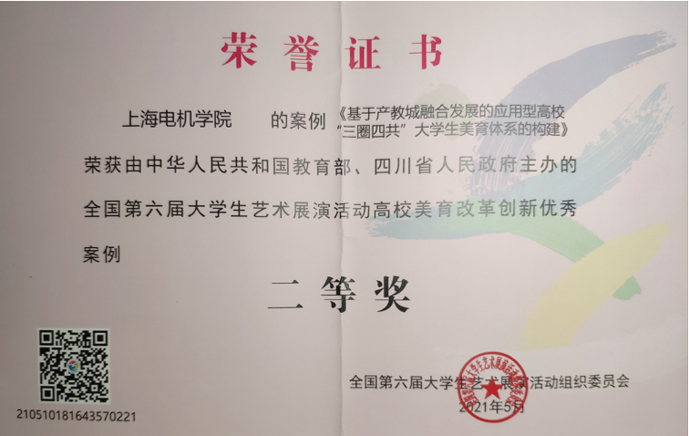 本成果获得“全国第六届大学生艺术展演活动高校美育改革创新优秀案例”国家级二等奖、上海市一等奖,并在“全国第六届大学生艺术展演上海市活动高校美育改革创新优秀案例点评报告会”上,作为三家(复旦大学、同济大学、pp电子游戏官网)展示高校中唯一一所市属高校,分享建设成果,获得市教委相关领导及与会专家、兄弟院校的一致好评。
