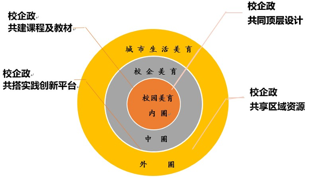学校将落实“立德树人”根本任务与“以美育人”有机融合,借鉴“产教融合+新工科”人才培养模式,构建产教城融合发展理念下的“三圈四共”大学生美育新模式。