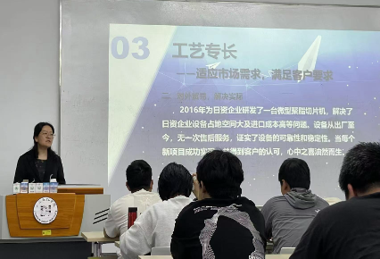 李红以“怀匠心,践匠行,做匠人”为题,向大家分享了30多年来在装备制造行业的成长与奋斗故事。作为一名土生土长的芦潮港人,从一开始的青涩懵懂,先后在车间一线、设备部、协作部、技术部等部门工作,在磨砺中逐渐成长、独当一面,成为技术部门负责人,她把最美的青春年华献给了车间和机床事业。李红至今热情不减、不断自我加压、勇于创新,率领公司技术团队,与中船重工集团704研究所合作,研发并生产出国内空白的首台智能快速扭矩校准装置,2020公司又为国家计量院研发制造国家级标准机并填补亚洲空白;曾获“浦东新区工程机械协会创新精英”及“浦东新区创新英才”称号,同时获发明专利2项,实用新型专利10项。她以一名普通技术人员的成长经历,教育和激励广大学子要敢于刻苦钻研、拼尽全力、创新永远在路上。随后,她从谱港机床的技术迭代中讲述了自己理解、诠释、践行的“工匠精神”:“不管在哪个行业,每一步都要脚踏实地去做。碰到问题,则要不断地创新思路,去解决它攻克它。”