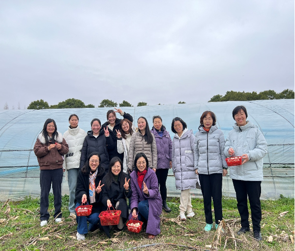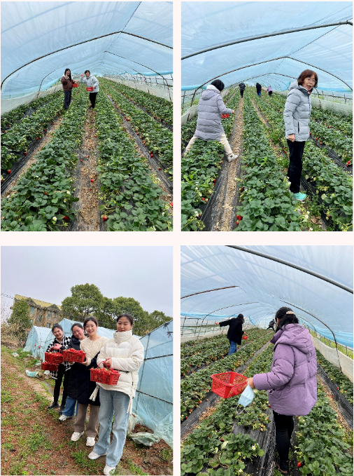 活动当天,女教职工们兴致勃勃地前往草莓采摘园。走进大棚,映入眼帘的是一片生机勃勃的景象:翠绿的叶子间点缀着鲜红欲滴的草莓,清甜的果香扑面而来。大家手提小篮,穿梭在田垄间,一边采摘一边交流,欢声笑语不断。亲手采摘的草莓不仅新鲜可口,更让大家体验到了劳动的快乐和收获的喜悦。