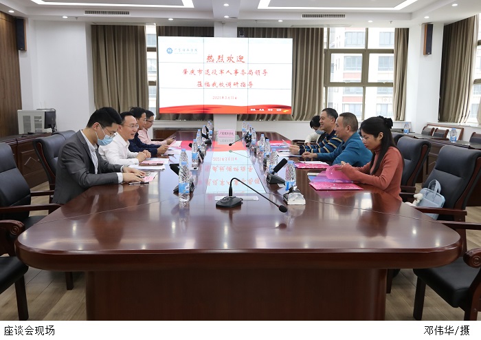 本网讯(宣传部 杨文丹)3月11日下午,肇庆市退役军人事务局副局长刘付运华一行到beat365调研。座谈会于科技楼12楼会议室举行,beat365副校长谭锦兴、继续教育学院院长、退役军人教育培训学院院长叶涌、继续教育学院副院长周文海、退役军人教育培训学院副院长刘东出席。