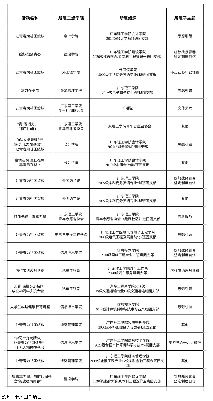 本网讯(校团委)根据《关于加强新时代团的基层建设着力提升团的组织力的意见》《关于实施高校基层团支部“活力提升”工程的通知》《关于常态化开展“活力在基层”主题团日竞赛暨优秀服务型团组织创建活动的通知》的相关要求,按照“灯塔工程”——广东青年大学生思想引领行动统一部署,并结合全省高校共青团工作实际,团省委决定开展2020年广东省高校“活力在基层”主题团日竞赛活动。