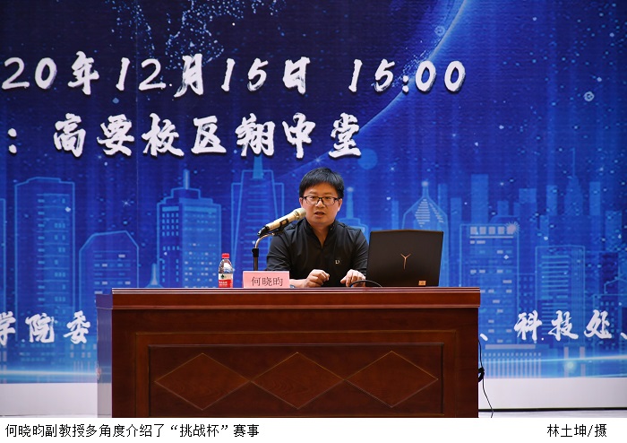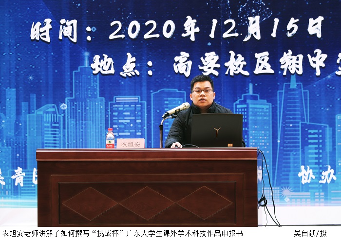 启动仪式过后,大会进行2021年“挑战杯”大学生课外学术科技作品竞赛宣讲会。宣讲会上,何晓昀副教授从赛事介绍、赛事安排、竞赛作品分类、申报注意事项四个角度全面介绍了“挑战杯”赛事,积极地为同学们答疑解惑。农旭安老师为同学们讲解了如何撰写“挑战杯”广东大学生课外学术科技作品申报书。