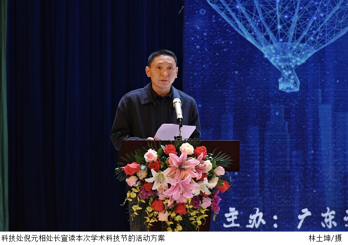 科技处倪元相处长宣读本次学术科技节的活动方案。倪处长宣读了本次学术科技节的主题、活动时间、活动内容和对作品的具体要求。伴随灿烂的鎏金粉洒落,金字的浮现,2021年大学生学术科技节正式启动。