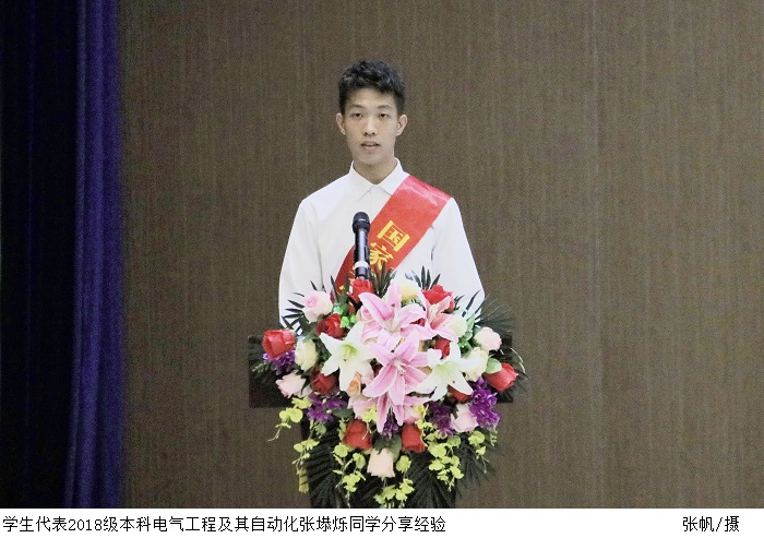 国家奖学金获得者、2018级本科电气工程及其自动化2班张塨烁同学分享了经验,一是树立远大理想目标,二是把握每一分每一秒,三是做好阶段规划。