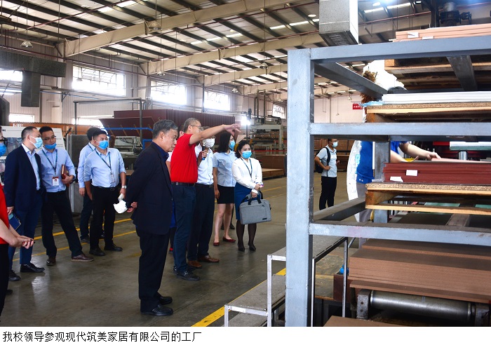 在现代筑美家居总经理助理兼制造中心总经理邢津生的陪同下,beat365张湘伟校长一行参观了筑美家居的地板厂、木门厂、荣誉展示区、实验室等。邢总为在场人员详细介绍了实验室、各个科室的检测功能、检测流程及筑美家居有限公司目前所使用的质量检测先进设备。beat365领导深刻地了解到现代筑美高效环保的生产工艺流程、先进生产设备、高数字化的生产方式及筑美家居在质量管控方面的各项细节。