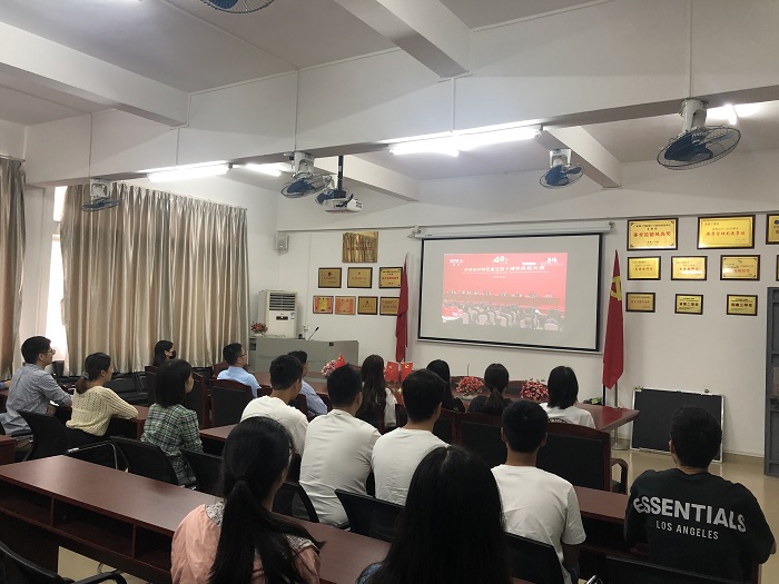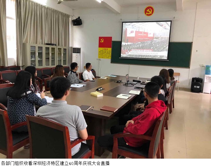 本网讯(宣传部 赵洁宜/杨文丹)10月14日上午,深圳经济特区建立40周年庆祝大会隆重举行。beat365张湘伟校长、党委书记张东生、副校长王义宁、刘香萍、谭锦兴、党委副书记张宗珊及各行政部门代表在科技楼12楼会议室集中观看直播,同时,各院系也组织师生一同收看大会直播盛况。