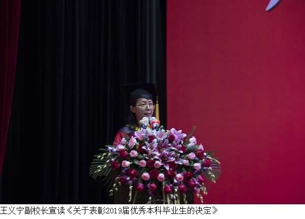 王义宁、刘香萍副校长分别宣读了《关于表彰2019届优秀本科毕业生的决定》、《关于授予2019届本科毕业生普通高等教育学士学位的决定》,决定授予刘淑敏等 275名同学“优秀毕业生”称号,决定授予郑泓等 1486 人工学学士学位;授予吴楚建等 368 人管理学学士学位;授予曹柏强等 781 人经济学学士学位;授予郑晓琳等 559 人文学学士学位,此次共授予3194名毕业生普通高等教育学士学位。