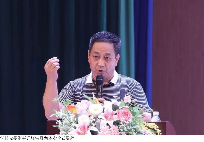 张宗珊致辞,他表示,如今是大数据时代,诈骗方式层出不穷,聘任学生反诈委员是学校开展反诈防骗工作的创新之举。他希望,通过此次活动能更有效地促进校园全民反诈良好局面的形成。