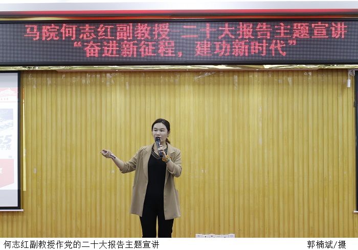 何志红副教授以《奋进新征程 建功新时代》为题,从改革开放是我们党的一次伟大觉醒;非凡十年——中国的十个维度;深化改革开放,推进高质量发展三个方面全面深入地进行宣讲。她强调,改革开放是当代中国发展进步的活力之源,是我们党和人民大踏步赶上时代的重要法宝,是坚持和发展中国特色社会主义的必由之路。新征程需要一步一步地走,新时代梦想的实现需要一点一滴地奋斗。青年大学生要认真学习党的二十大精神,怀抱梦想又脚踏实地,敢想敢为又善作善成,立志做有理想、有担当、能吃苦、肯奋斗的新时代好青年。