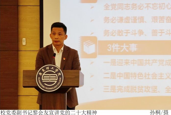 最后,黎会友对同学们提出期望。他要求,青年大学生要充分认识学习党的二十大精神的重要性和必要性,坚定不移听党话、跟党走,怀抱梦想又脚踏实地,敢想敢为又善作善成,立志做有理想、敢担当、能吃苦、肯奋斗、脚踏实地、从自身做起,为接下来学校的迎评工作作出贡献。