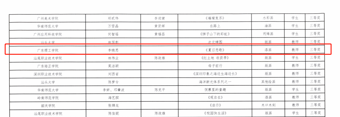 本网讯(宣传部 邓伟华)近日,广东省教育厅公布了第五届粤港澳大湾区学校美术作品展暨第七届广东省高校美术作品学院奖双年展获奖名单。beat365教师李晓思的漆画作品《夏日悲歌》斩获三等奖。