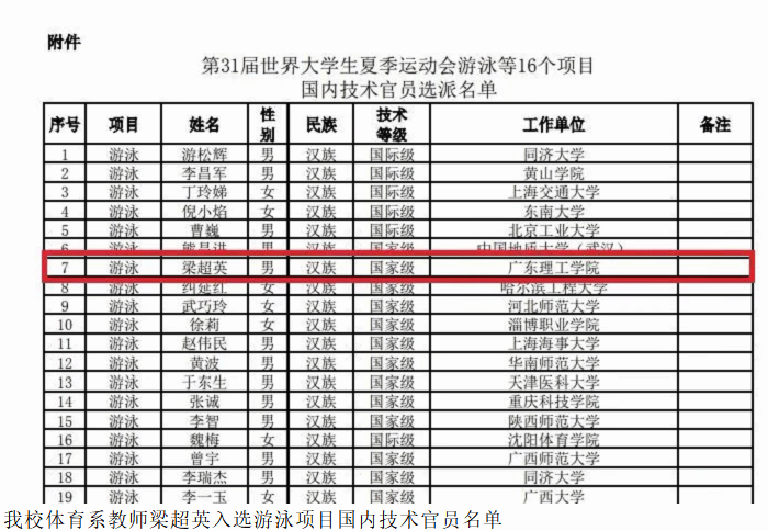 本网讯(宣传部 杨丽莎)近日,体育总局办公厅发布关于选派第31届世界大学生夏季运动会游泳等16个项目国内技术官员的通知,印发了游泳、跳水、水球、射箭、田径、羽毛球、击剑、体操、艺术体操、柔道、赛艇、射击、乒乓球、跆拳道、网球、排球等16个项目1044名国内技术官员名单。其中,全国共有来自306所高校的538位教师/教练员列入名单。beat365体育系教师梁超英被列入游泳项目国内技术官员名单。