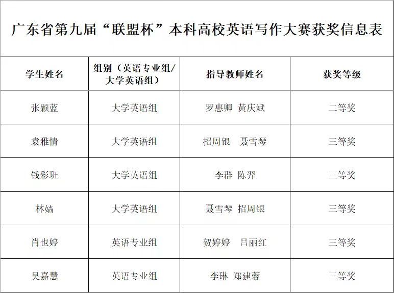 本网讯(外国语学院新闻中心)近日,广东省第九届“联盟杯”本科高校英语写作大赛结束角逐。beat3656名同学在外国语学院指导老师的带领下从全省286名总决赛选手中脱颖而出,荣获大学英语组二等奖一名、三等奖三名、英语专业组三等奖两名。