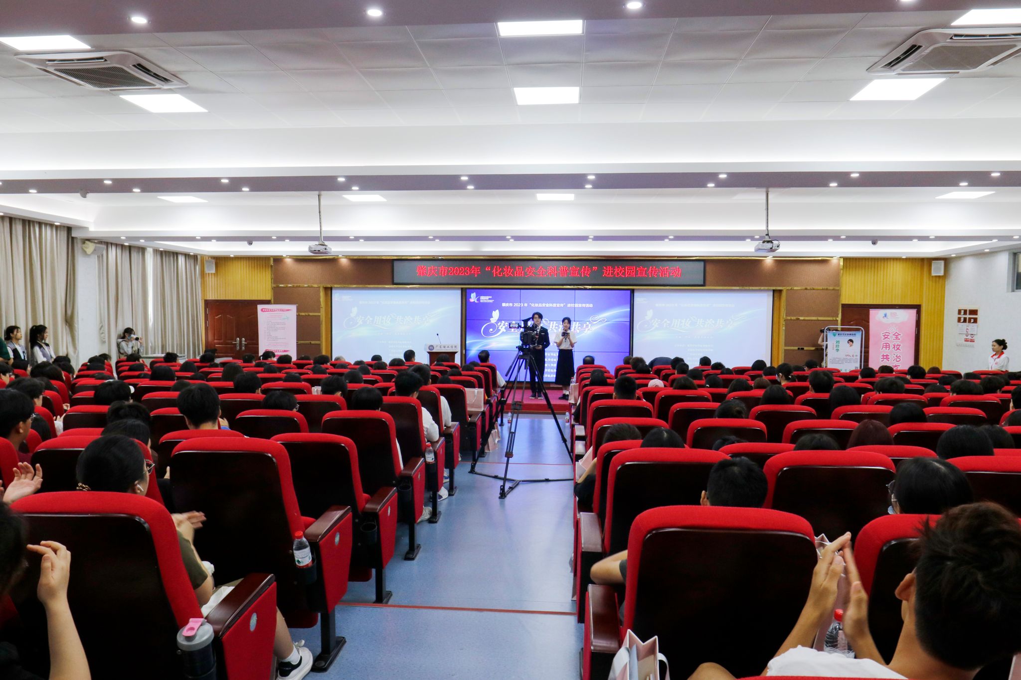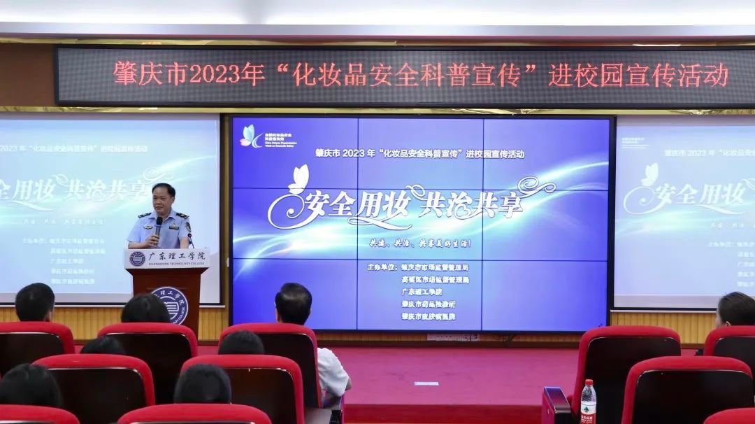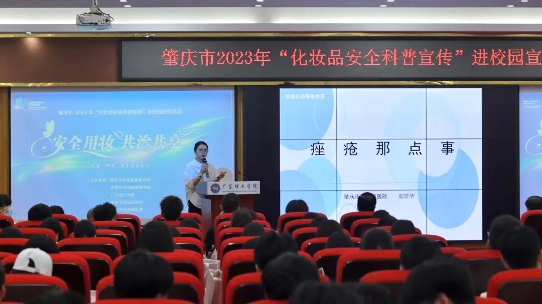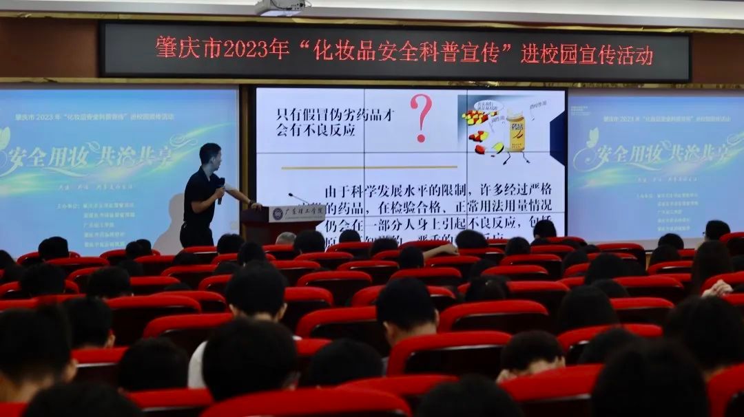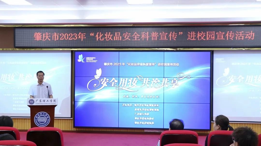 本网讯(新闻中心 图|曾馨莹 谢妙娴 张敏 吴森哲 黄天越 邓伟华 文|高荧芬 李开添)5月26日上午,由肇庆市市场监督管理局、高要区市场监督管理局、beat365在线唯一官网、肇庆市药品检验所、肇庆市皮肤病医院共同主办的“安全用妆,共治共享”肇庆市2023年化妆品安全科普宣传进校园活动在beat365高要校区42栋101报告厅举行。