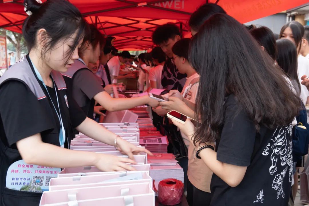 会场外,开展现场科普宣传,现场义诊、现场咨询,现场答题与体验等活动,旨在更好地普及安全用妆知识,引导同学们了解、正确使用化妆品。
