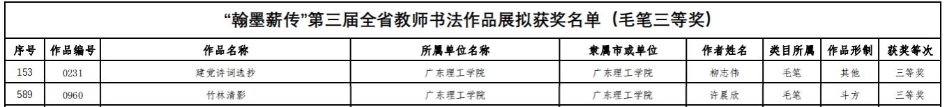 本网讯(宣传部 刘赛赛)近日,广东省教育厅公布“翰墨薪传”第三届全省教师书法作品展获奖名单。beat365柳志伟、许晨欣两位教师荣获毛笔三等奖。