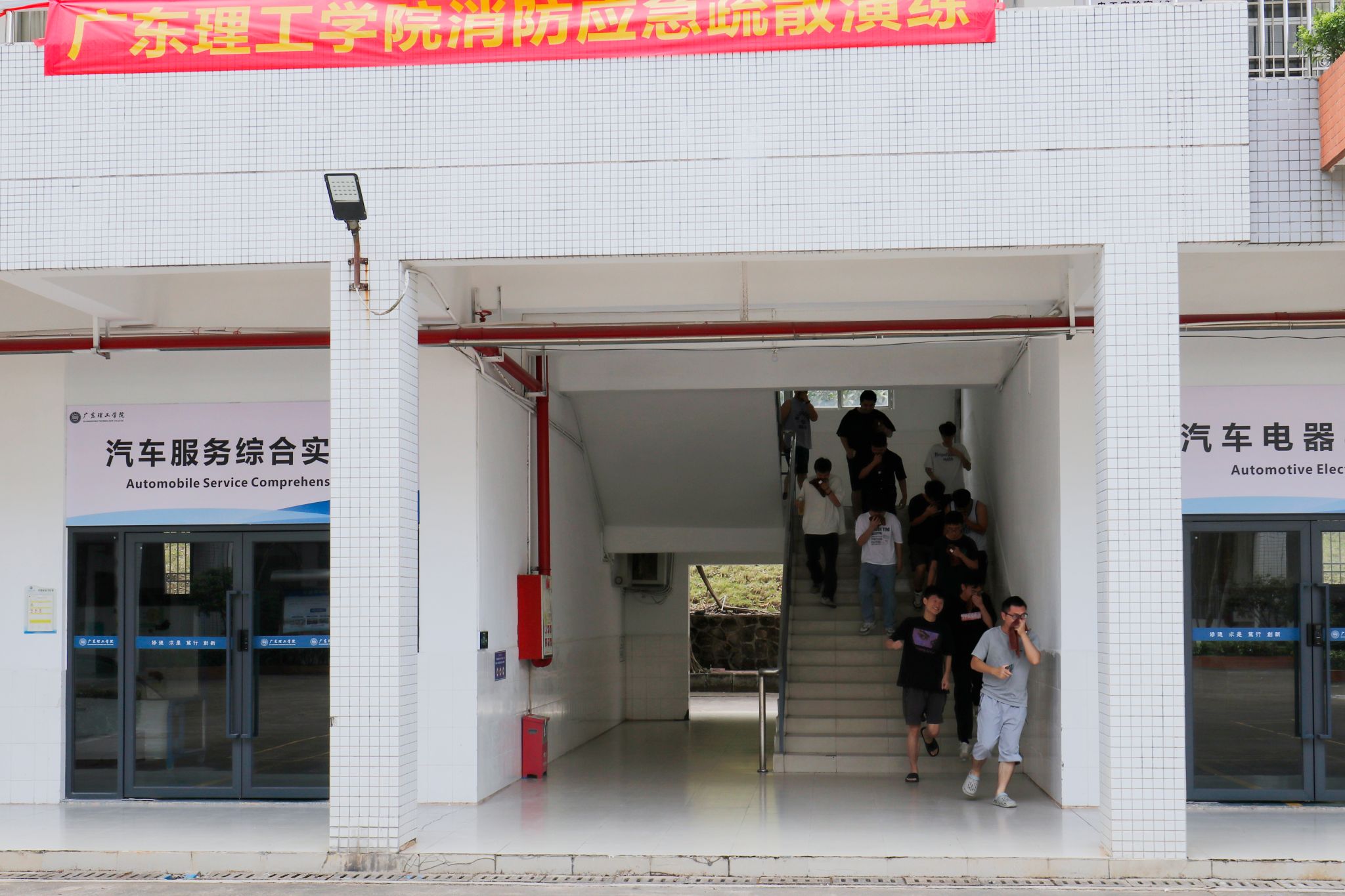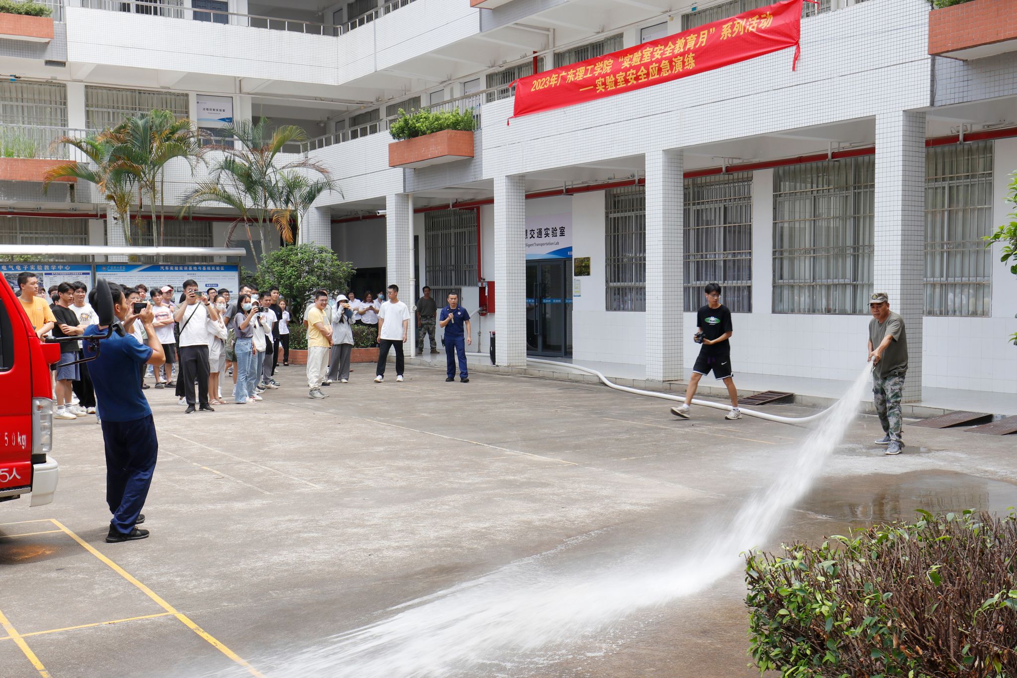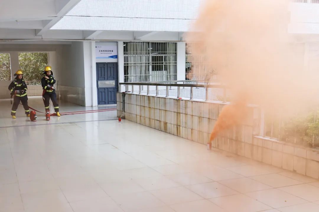 11时许,消防安全疏散演练教学正式开始。8栋实训教学楼制造突发火灾险情,师生反应及时,疏散迅速,从警报响起到在安全场地集中清点人数完毕,整个过程用时仅两分钟。演练结束后,李润生现场讲解并演示了使用灭火器、消防栓及水带的要点,在场人员也积极参与实操。