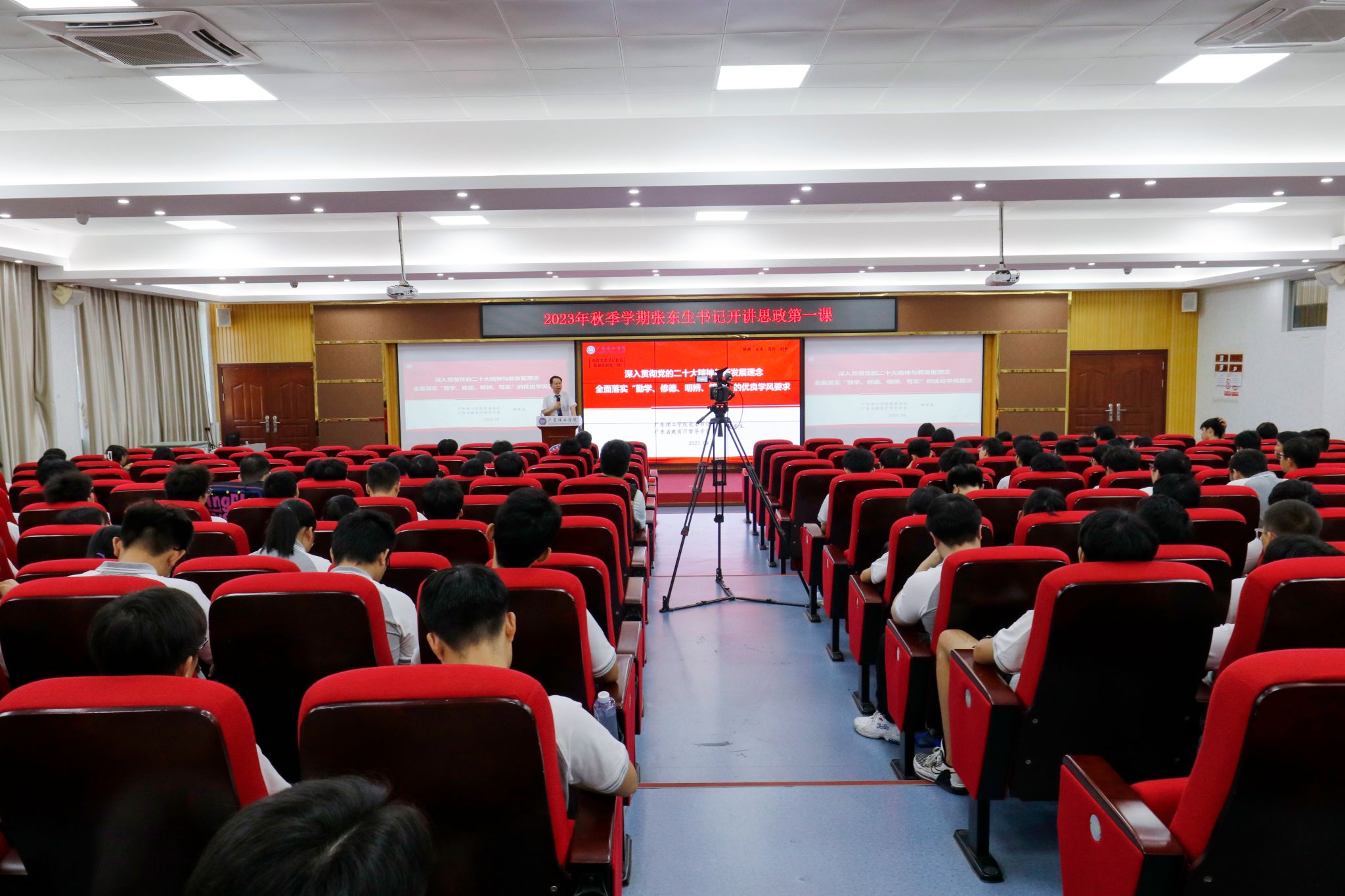 本网讯(新闻中心)为了提升思想政治教育亲和力和针对性,满足学生成长发展需求和期待,深刻理解思政课在学校课程体系中的政治引领和价值引领作用,9月20日上午,党委书记张东生在beat365高要校区42栋报告厅开讲主题为“深入贯彻党的二十大精神与新发展理念,全面落实‘勤学、修德、明辨、笃实’的优良学风要求”的“思政第一课”。