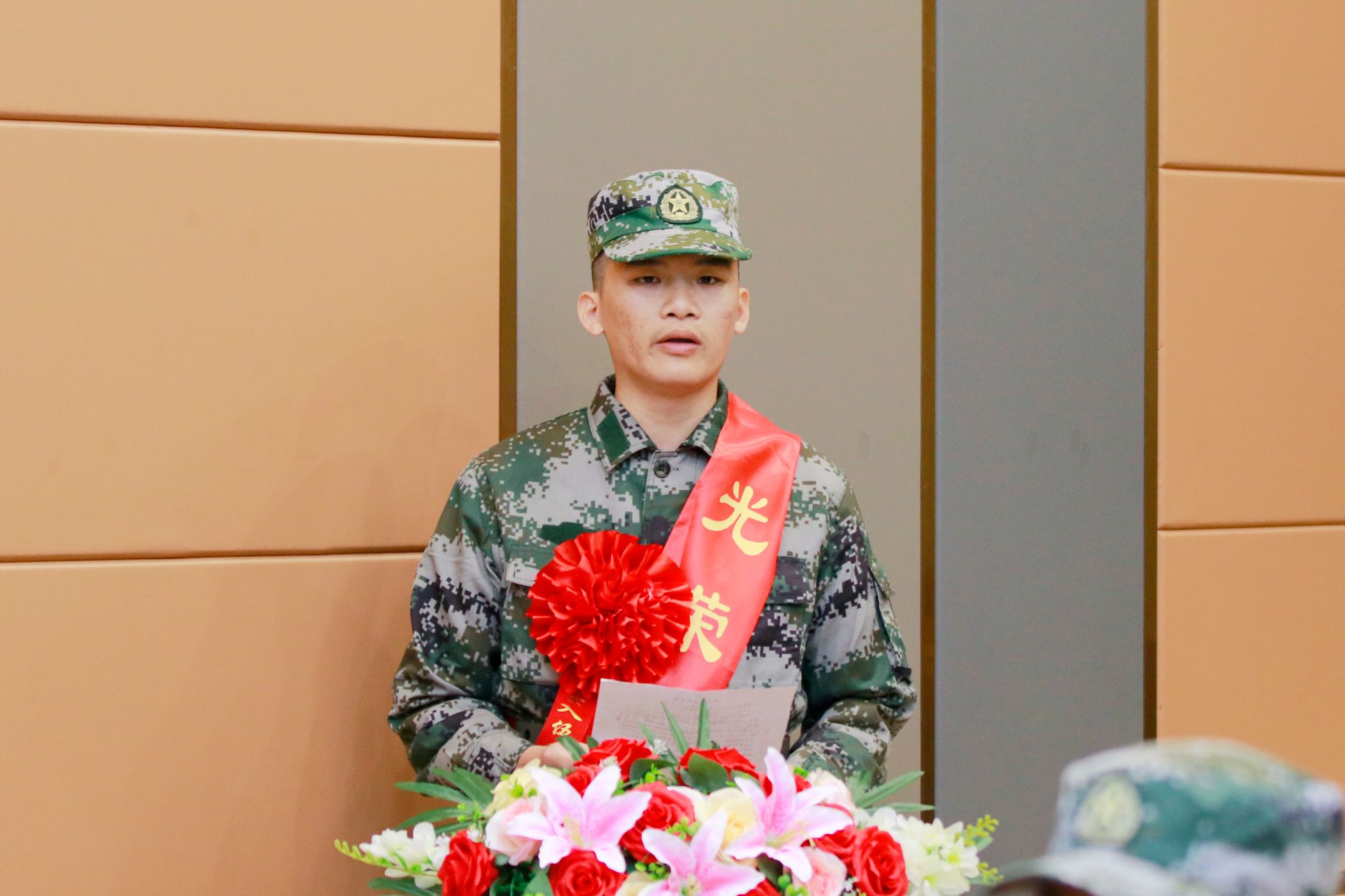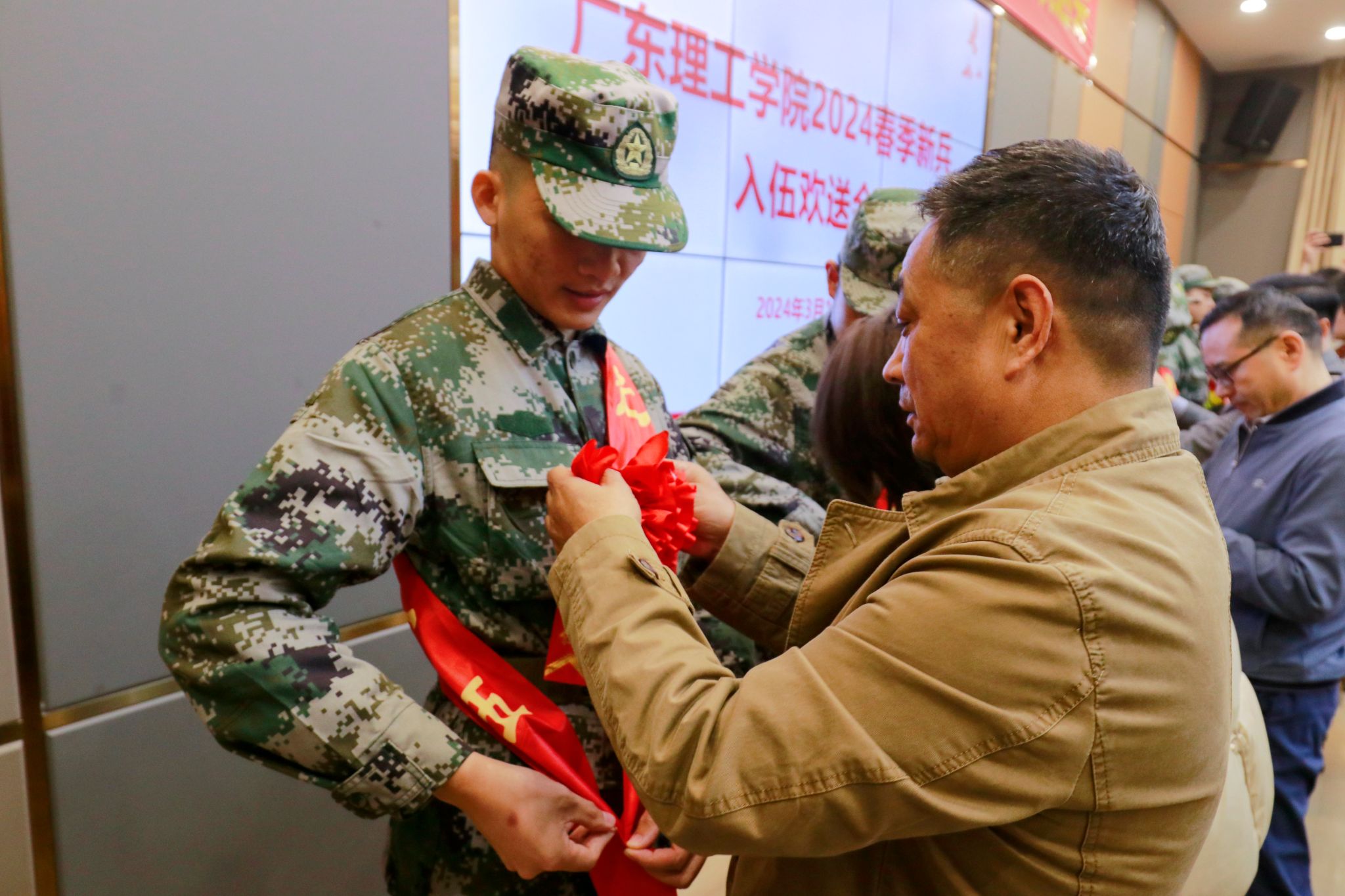 会上,谭蒙革宣读2024年春季学校入伍新兵名单,学校领导为新兵佩戴入伍绶带及大红花。