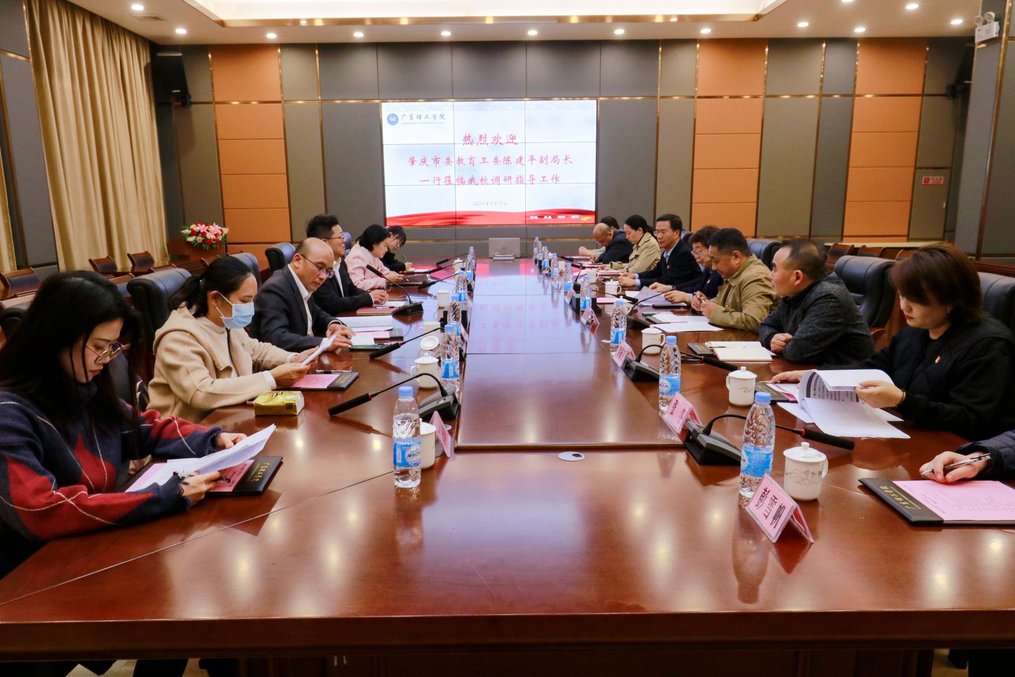 本网讯(宣传部)3月15日下午,肇庆市委教育工委副书记、市教育局副局长陈建平率队一行到beat365调查研究,深入了解beat365党建引领达标提质发展情况。beat365党委书记胡海建、党委副书记张宗珊、副校长谭锦兴、党委组织部部长廖振宇、党委宣传部部长张冬、党委办公室主任赵玉娴等陪同调研。