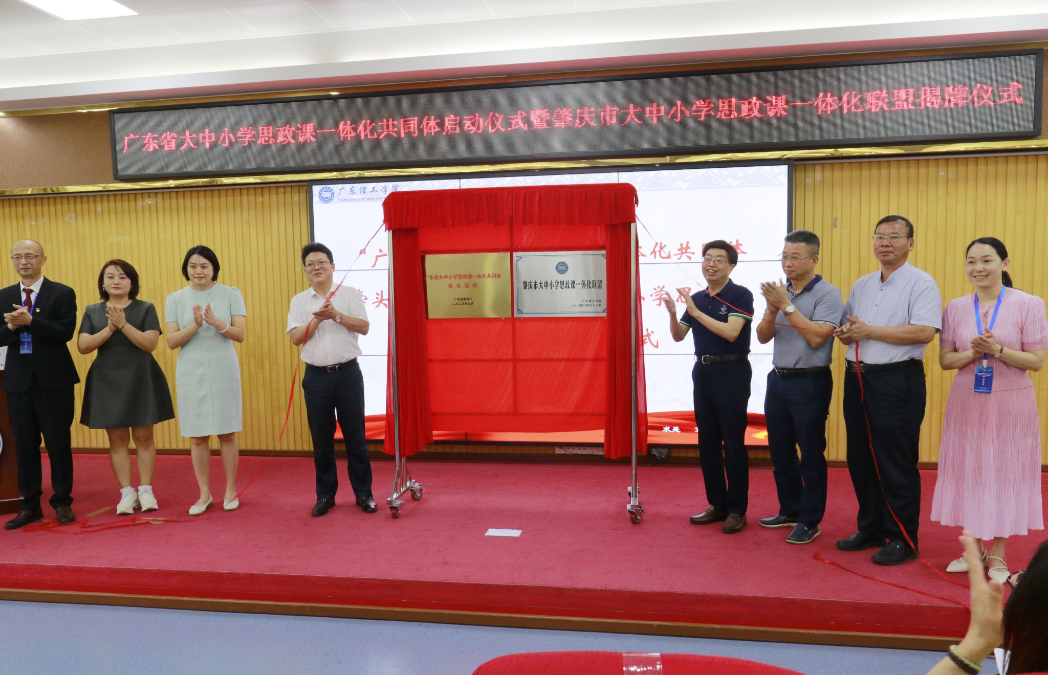 与会嘉宾为“广东省大中小学思政课一体化共同体牵头高校”暨“肇庆市大中小学思政课一体化联盟”揭牌。“广东省大中小学思政课一体化共同体项目单位”和“肇庆市大中小学思政课一体化联盟单位”代表也相继接受聘书。