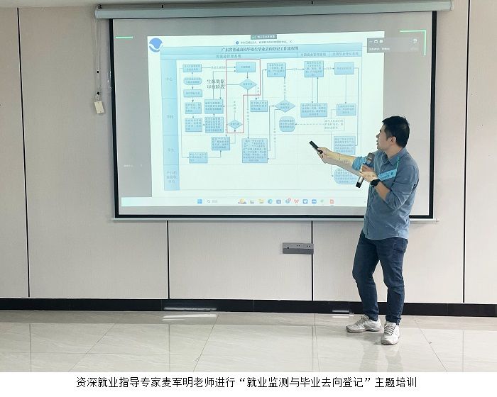 培训会议的核心环节是特邀资深就业指导专家麦军明老师进行的“就业监测与毕业去向登记”主题培训。麦老师围绕就业监测相关工作的具体要求、毕业去向登记的工作流程、生源数据的动态调整机制、毕业去向落实率分母的科学计算方法、毕业去向的明确界定标准、就业数据的规范化上报流程以及就业核查的严谨执行等七个核心要点展开了详尽的讲解。他强调了数据规范性对于就业统计的重要性,并提出了一系列行之有效的数据管理和监测建议,以确保就业信息的准确性和全面性。