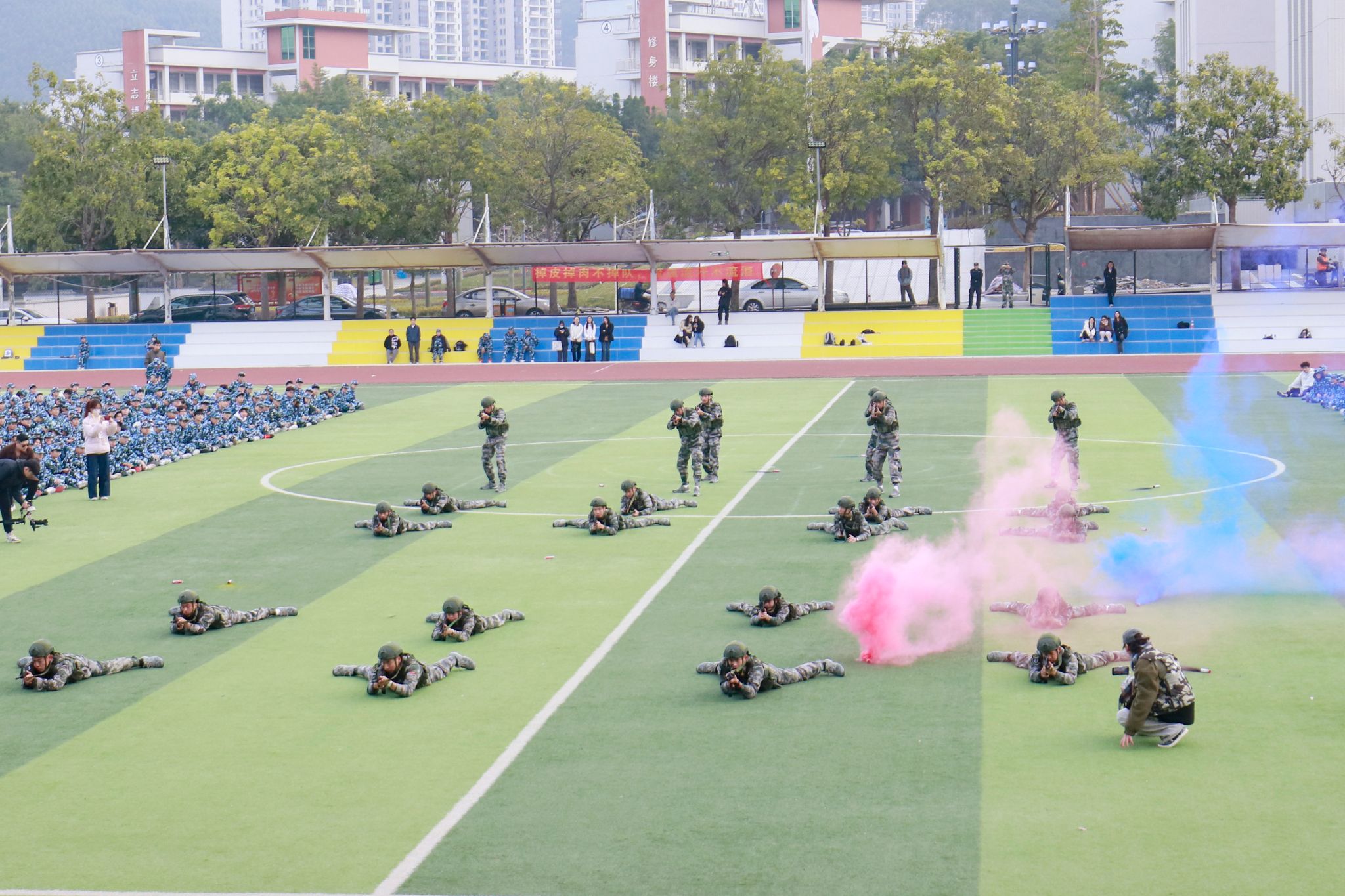 2024级新生军训动员大会在授旗仪式后圆满结束。会后,2024级新生们分别前往训练场展开训练,开启为期14天的军训生活。