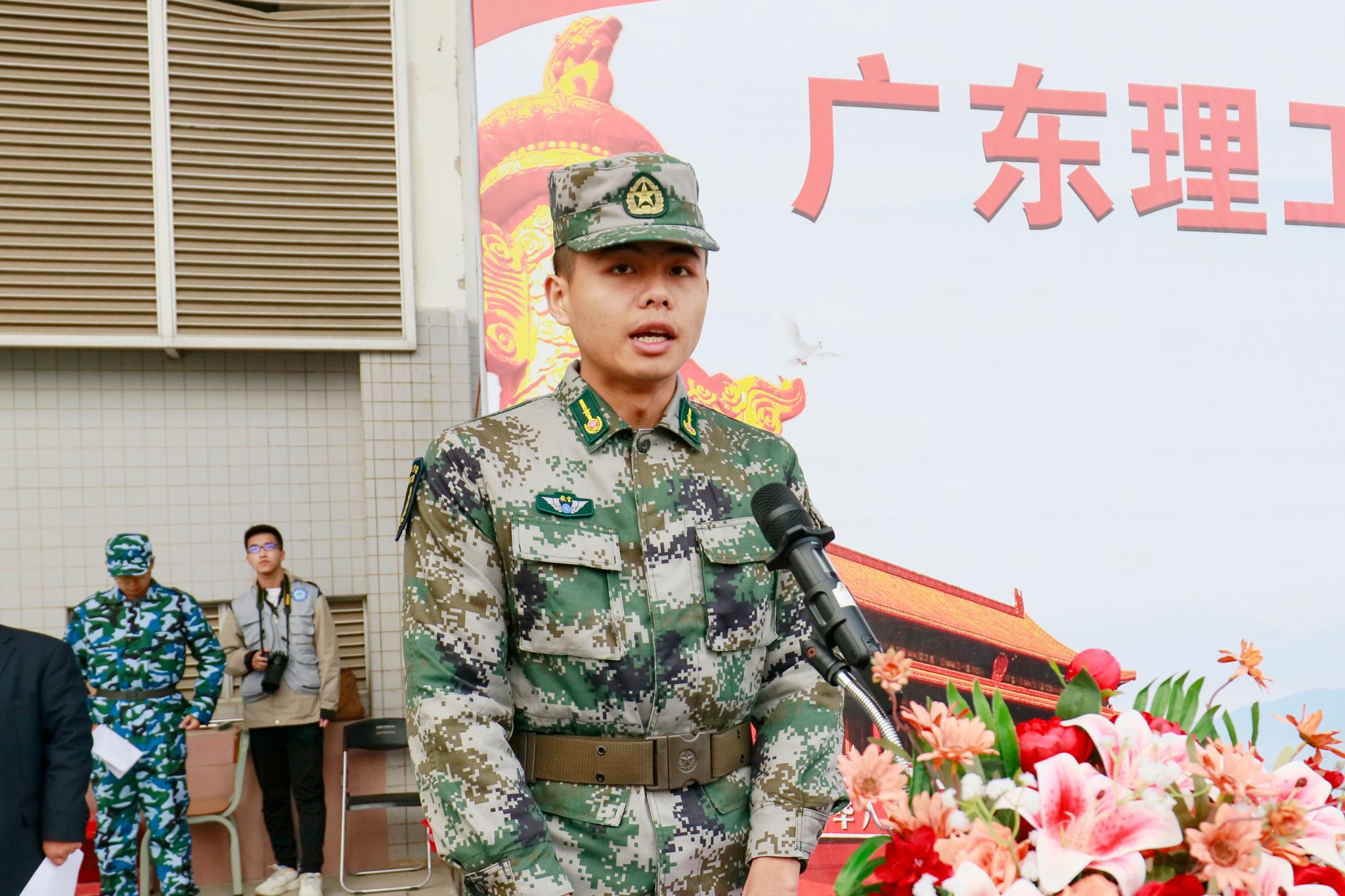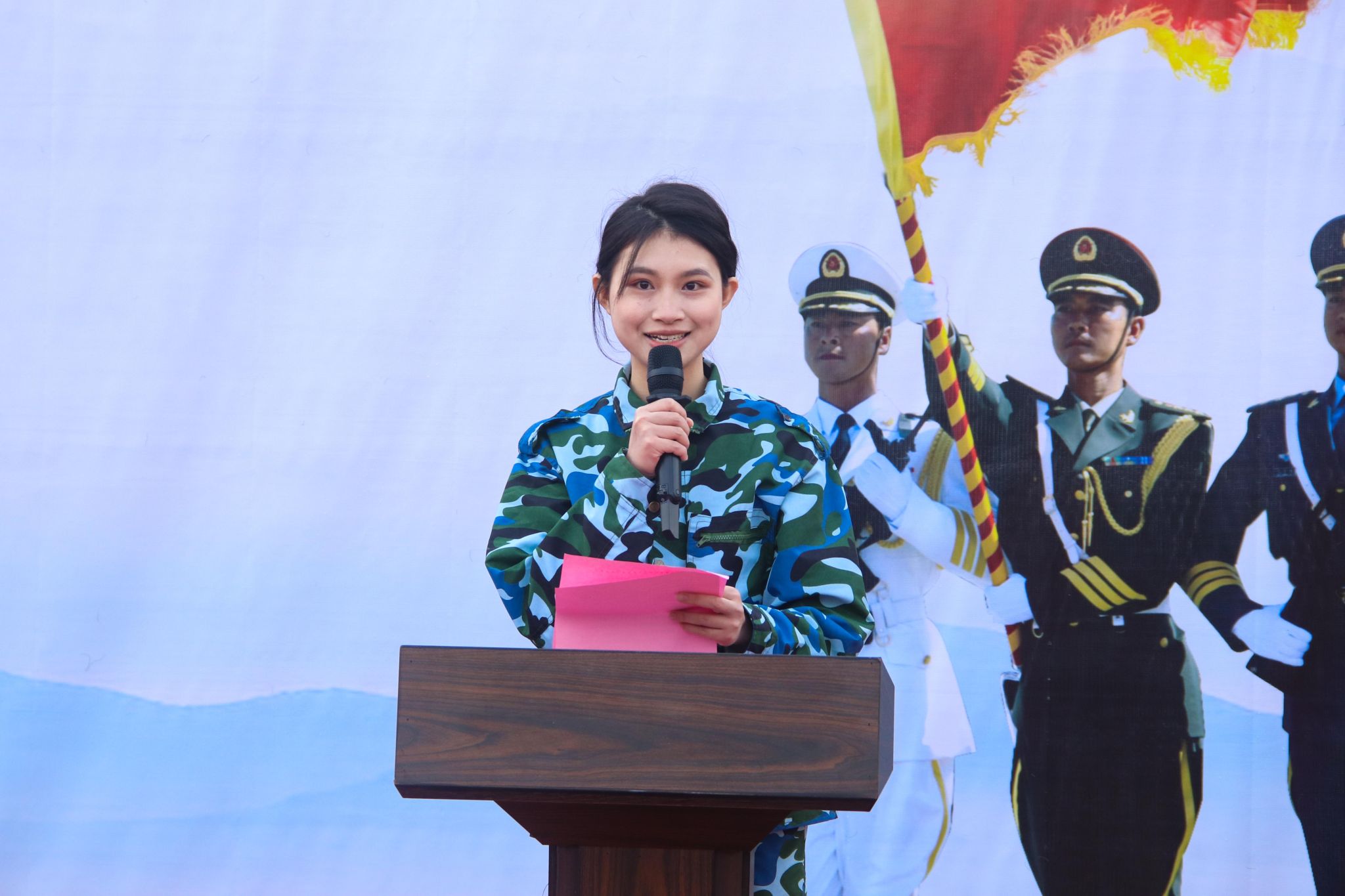 2024级本科商务英语3班崔艺川、经济管理学院跨境电子商务3班林佩君代表全体参训同学庄严承诺。尊重教官,尊重师长,服从命令,听从指挥……吃苦耐劳、拼搏向上,磨炼坚强意志,锻炼过硬体质。