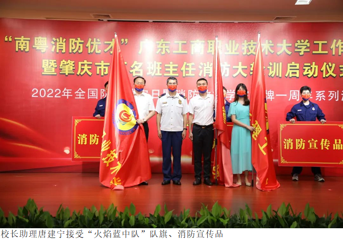 本网讯(保卫处 王斌)5月20日下午,广东省消防总队联合教育部门,在广东工商职业技术大学共同举行“南粤消防优才”工作室揭牌暨肇庆市万名班主任消防大轮训启动仪式。beat365校长助理唐建宁受邀参会。保卫处消防科陈金炼科长、2名消防专员以及7名辅导员参加此次活动。