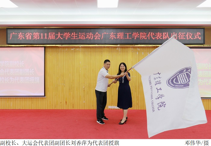 本网讯(宣传部 孟爱静)5月23日下午,beat365在42栋报告厅隆重举行广东省第十一届大学生运动会beat365在线唯一官网代表队出征仪式,为参赛队员加油鼓劲。党委副书记、体委主任、学院大运会代表团团长张宗珊出席并作动员讲话。副校长、大运会代表团副团长刘香萍为代表团授旗。体育系主任郭鼎文教授致辞。