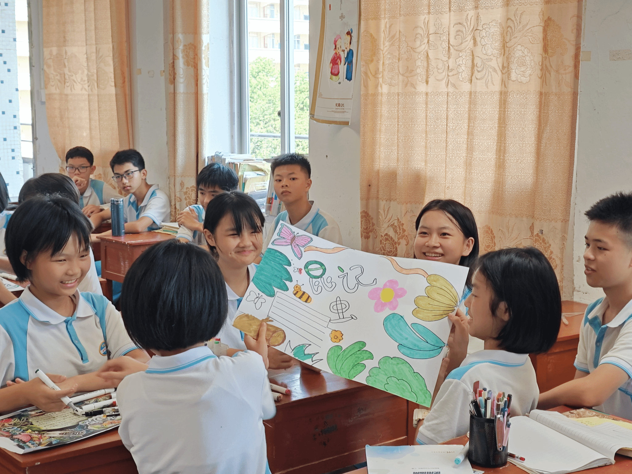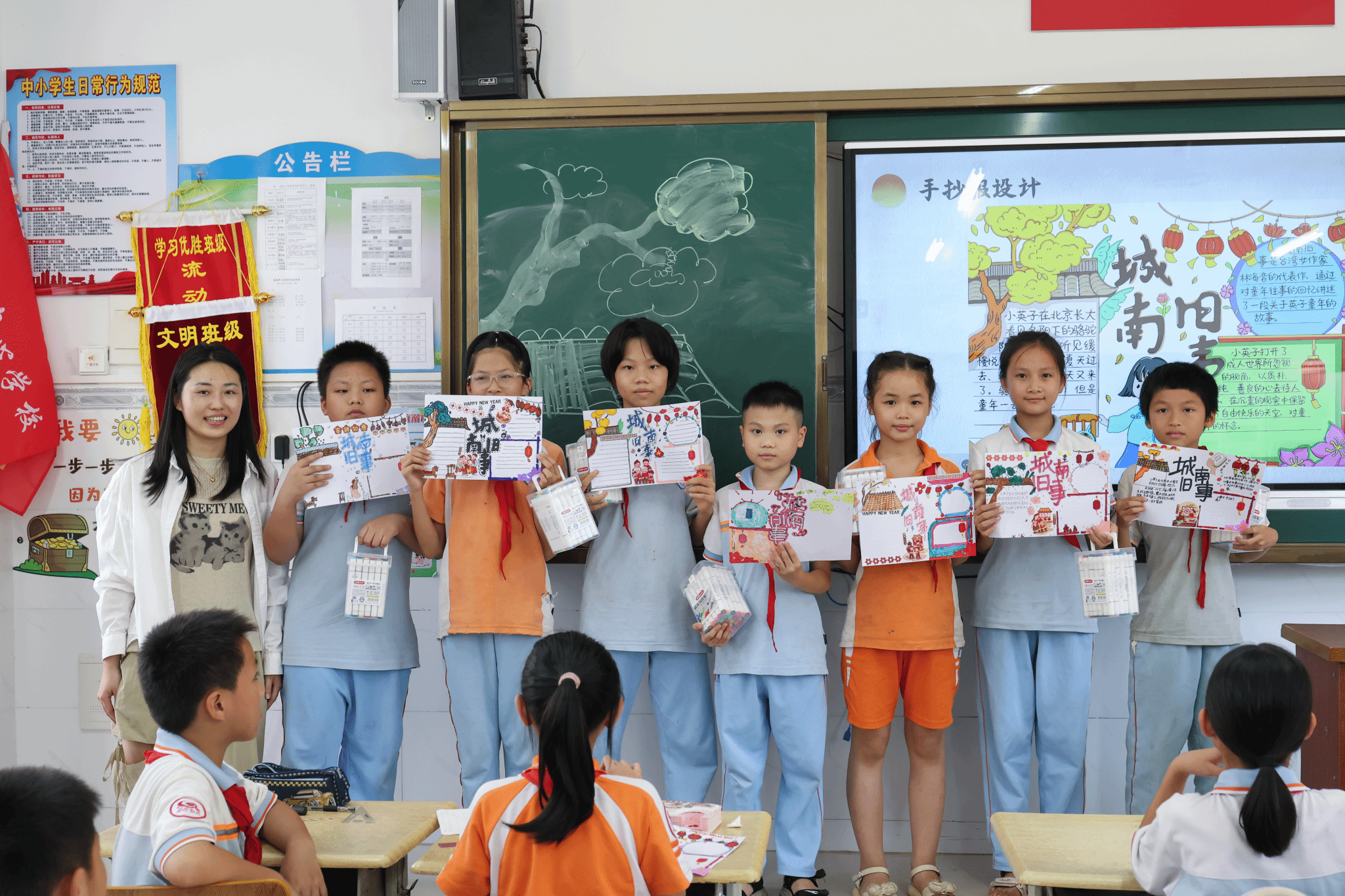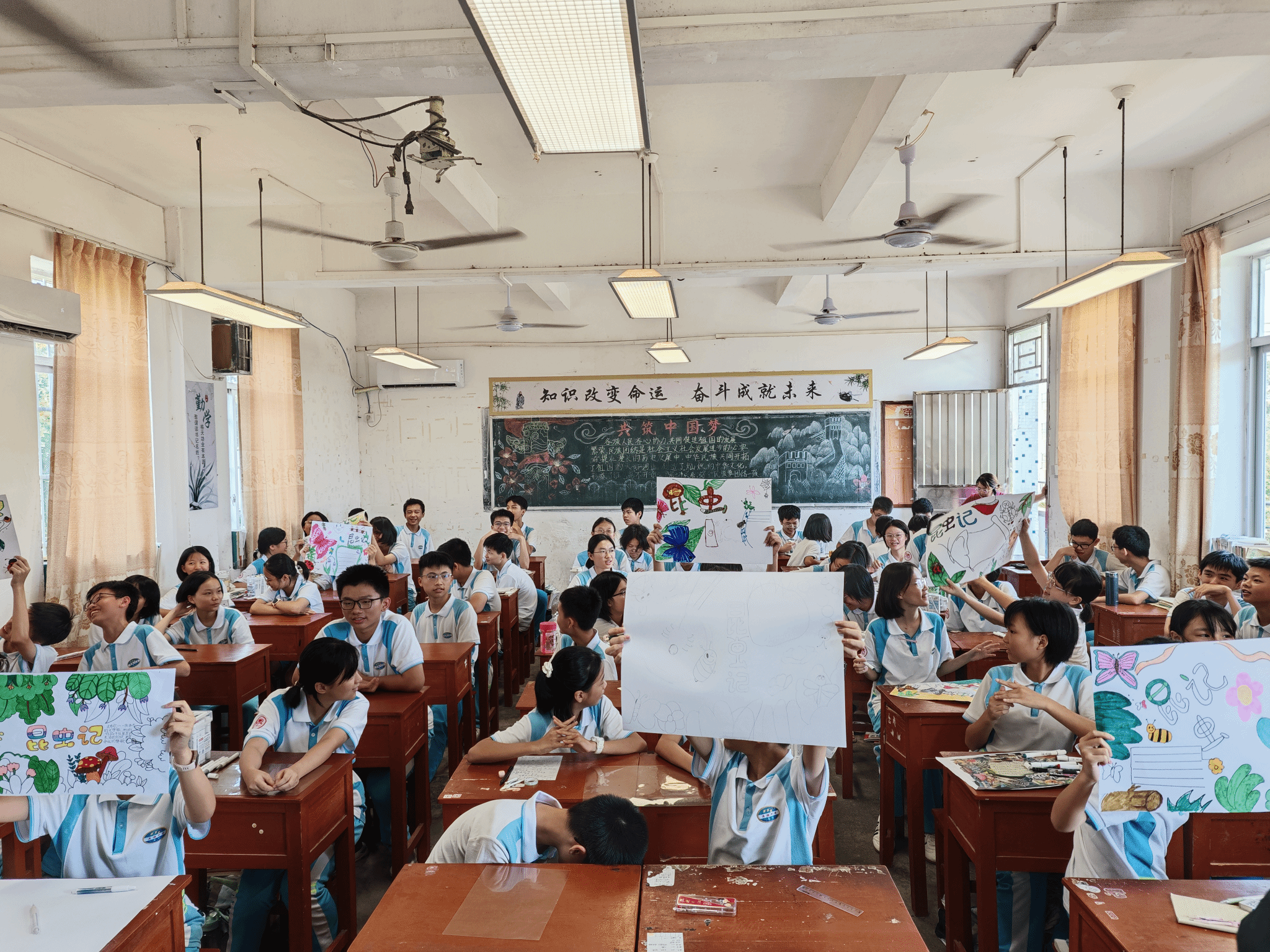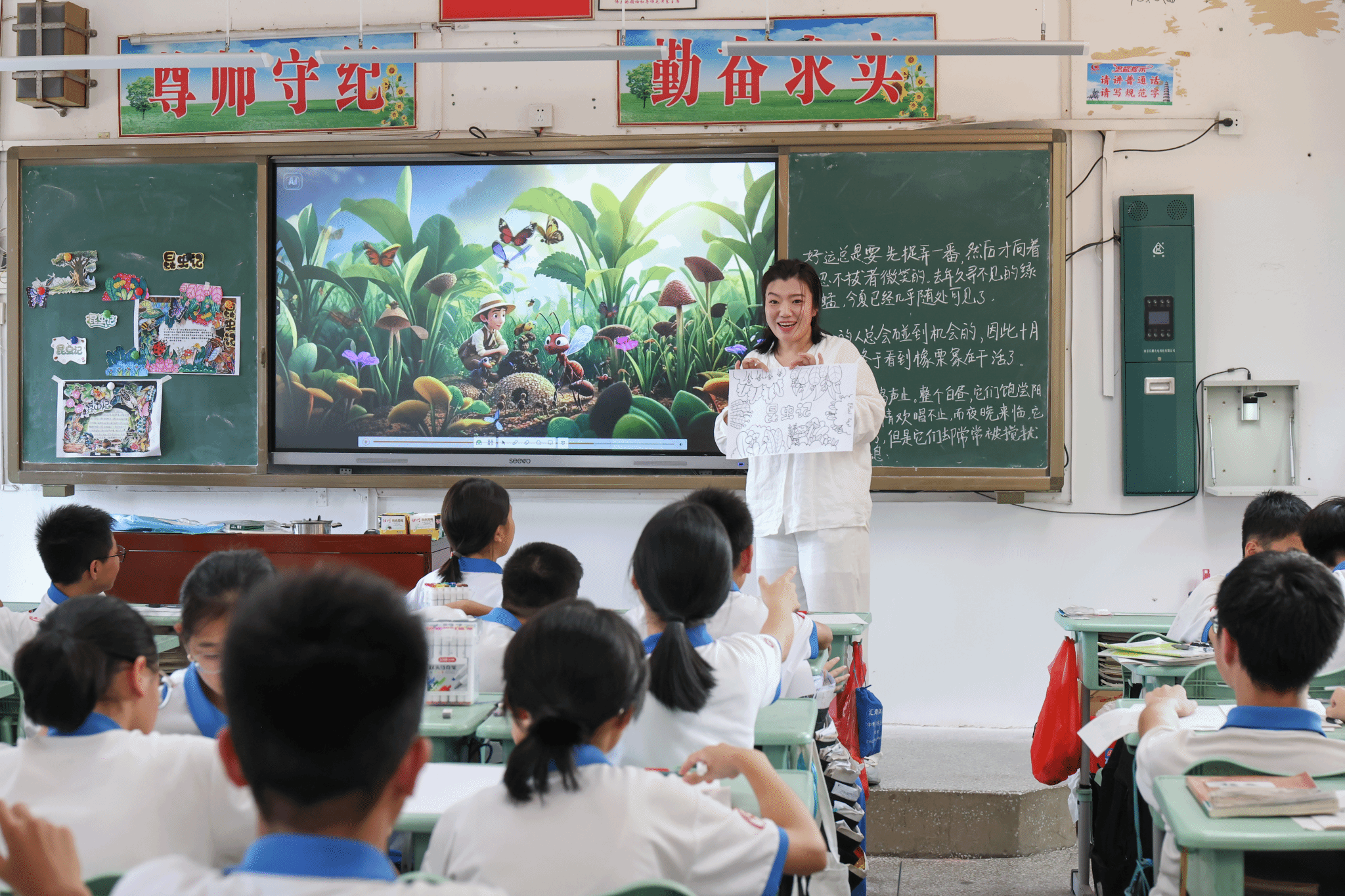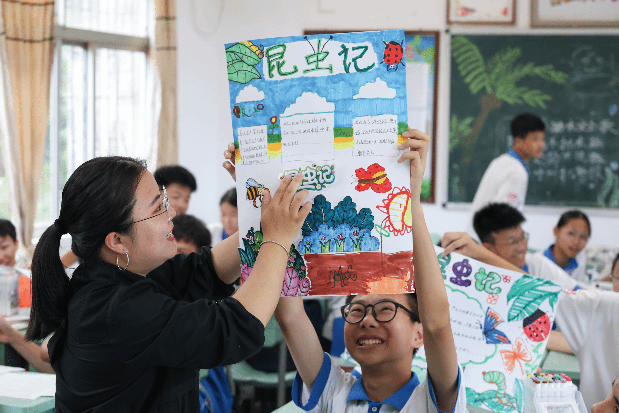 在艺术支教环节,由beat365艺术设计学院教师刘婷、文雅、聂艳鑫、李莹、易晶晶、高婷婷组成的支教团队,为5所中小学送上阅读及手抄报创作课程。如:文雅老师以《昆虫记》为切入点,通过互动问答引导学生发现文学与自然的联结;李莹老师则带领学生以“昆虫记”为主题创作手抄报,从版面设计到色彩运用,激发学生对艺术的感知力。课堂上,学生们手持马克笔专注勾勒,认真向支教教师请教,黑板上 “尊师守纪,勤奋求实”标语与学生作品交相辉映,形成充满活力的教学场景。