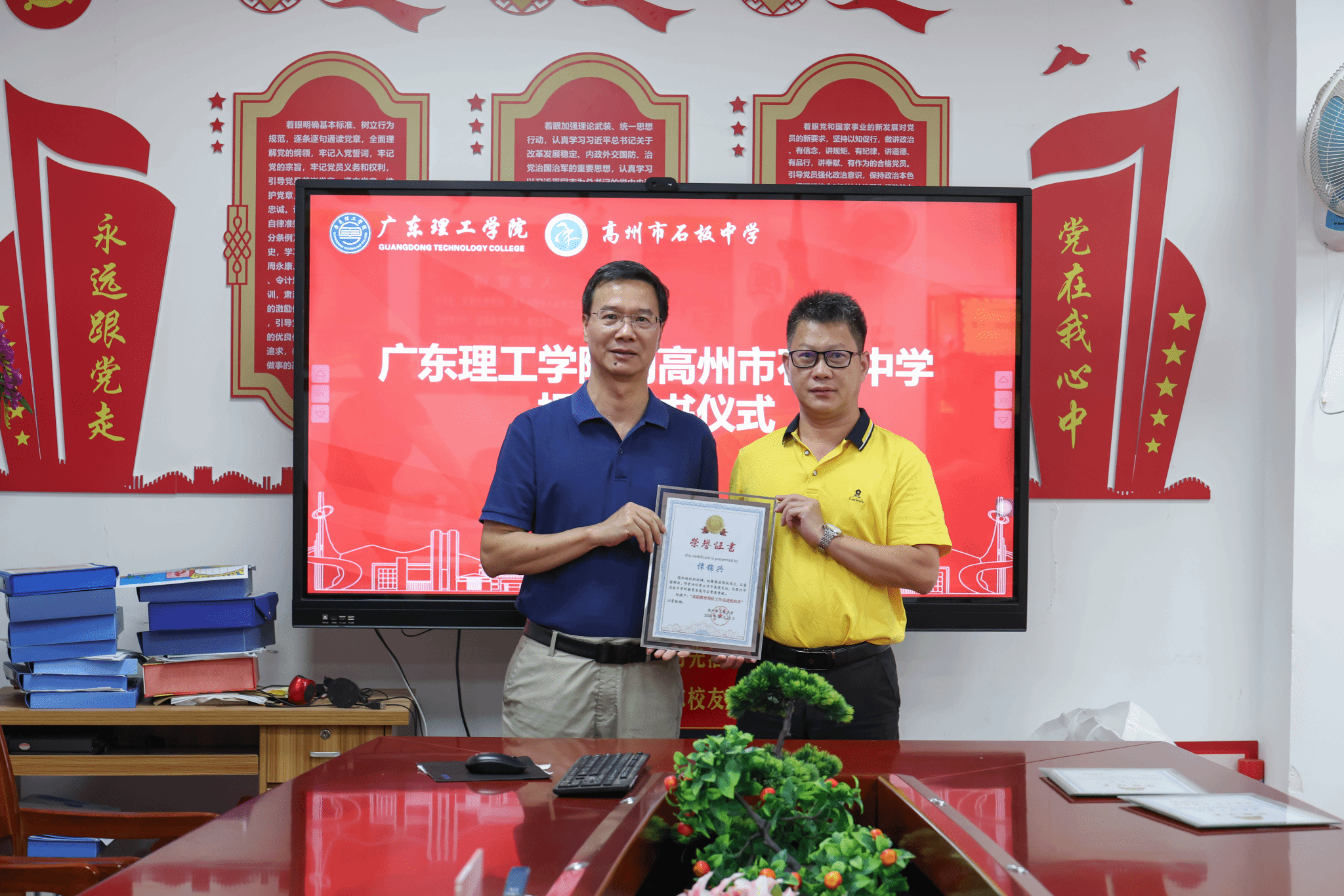 “希望这些书籍能成为孩子们看世界的窗口,让阅读照亮他们的成长之路。”谭锦兴副校长在“爱·悦读图书室”挂牌仪式上谈道,图书室不仅是物理空间的建设,更是阅读生态的培育,通过“纸质 + 数字”双轨模式,相信可以破解乡村学校图书资源陈旧匮乏的困境。在石板中学,校长覃雄彪代表受援学校回赠捐赠证书及“基础教育帮扶工作先进组织者”荣誉证书,并表示“图书室将成为学生探索世界的起点”。