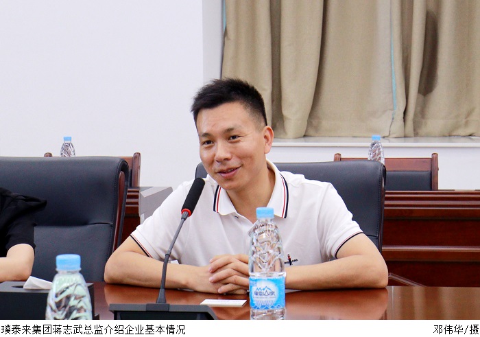 蒋志武介绍集团分布、生产、研发等情况,分享企业学生培养计划,提出校企合作可以从项目研发、成果转化等方面逐步开展。