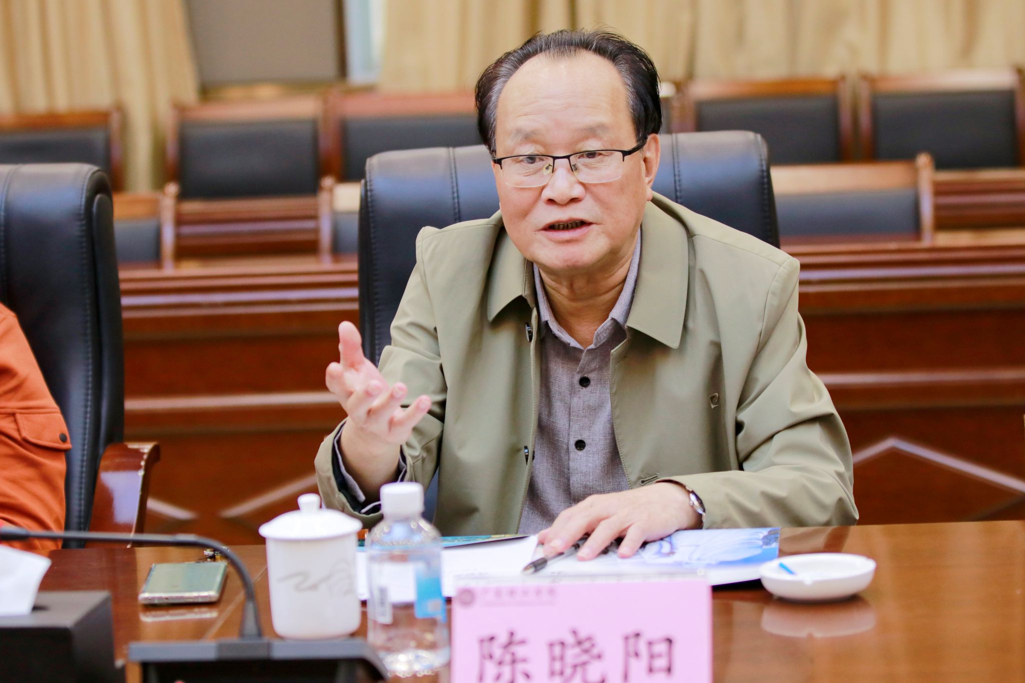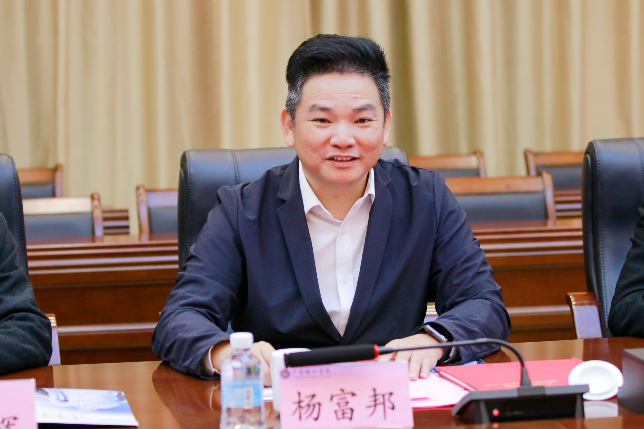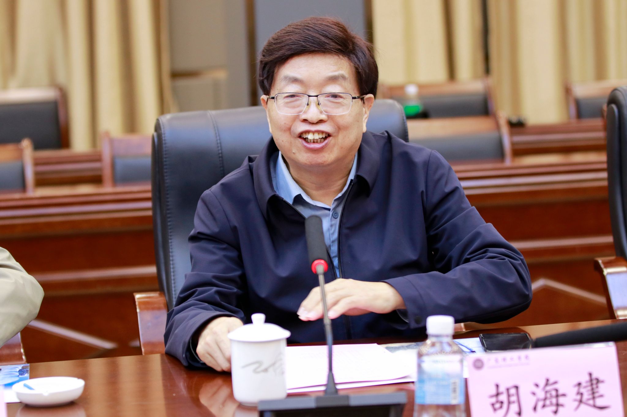随后,党委书记胡海建代表学校对杨富邦区长一行的到来表示热烈欢迎,并介绍了校方与会主要人员。他对斗门区委区政府及各相关部门、企业长期以来对学校发展的关心与支持表示感谢,并期待通过此次交流,进一步拓展合作空间。