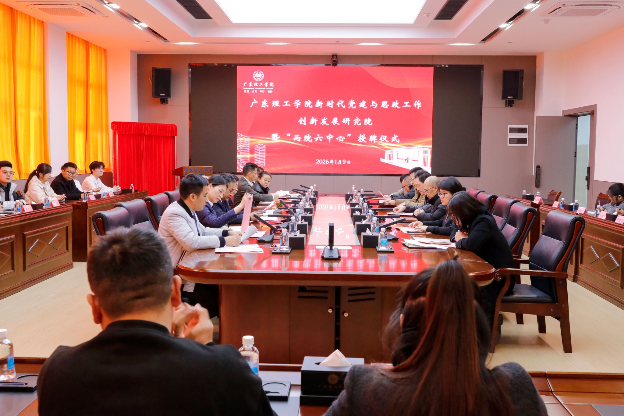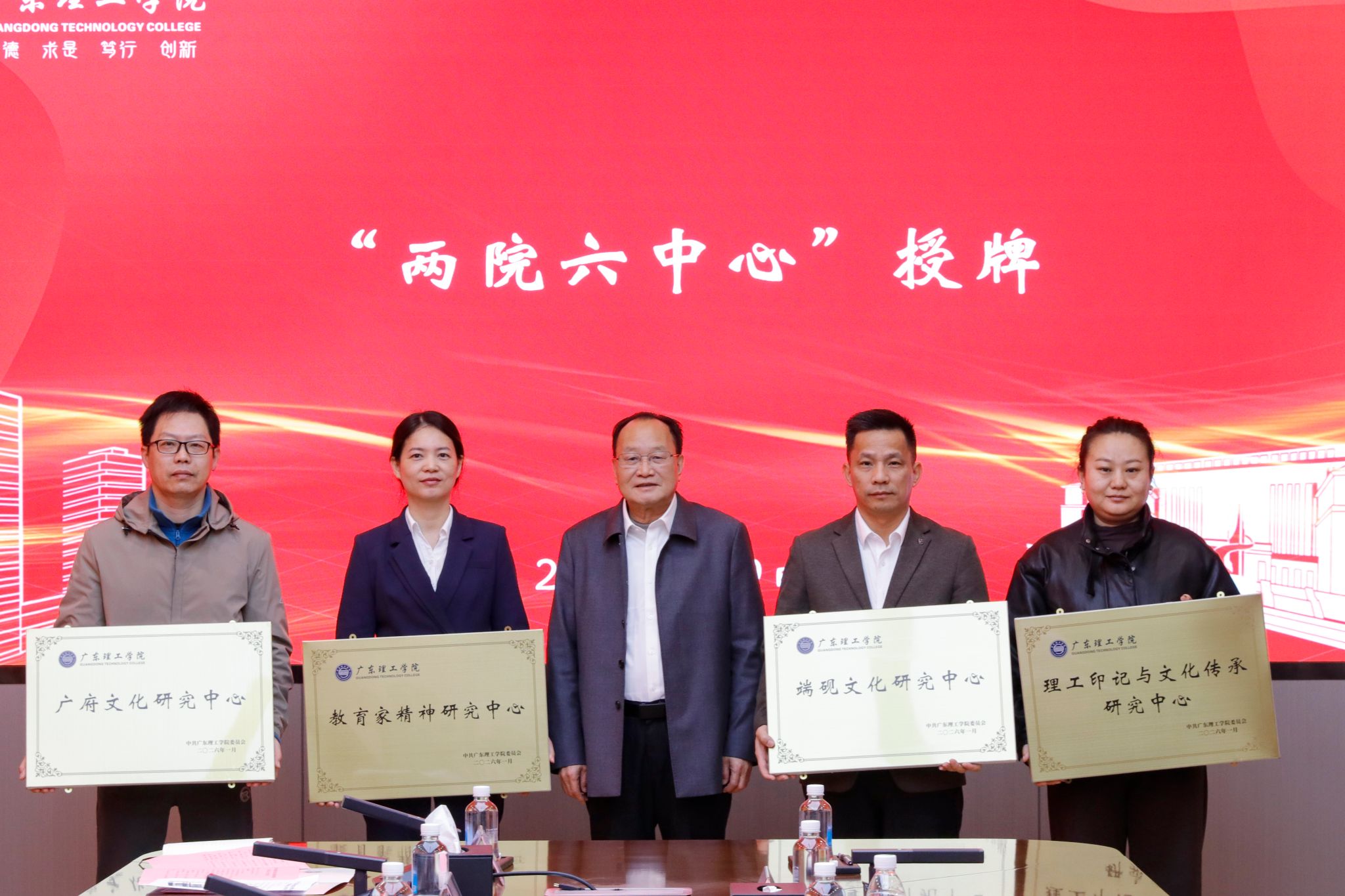 本网讯(组织部)1月9日上午,beat365在高要校区求实楼会议室举行新时代党建与思政工作创新发展研究院暨“两院六中心”授牌仪式。党委书记胡海建、校长陈晓阳、党委副书记黎会友、副校长唐建宁出席仪式。党委组织部、党委宣传部、党委教师工作部、党委学生工作部负责人及各研究院(中心)主持人、研究成员参加活动,共同见证学校党建与思政工作迈向创新融合新阶段的重要时刻。仪式由学校党委副书记张宗珊主持。