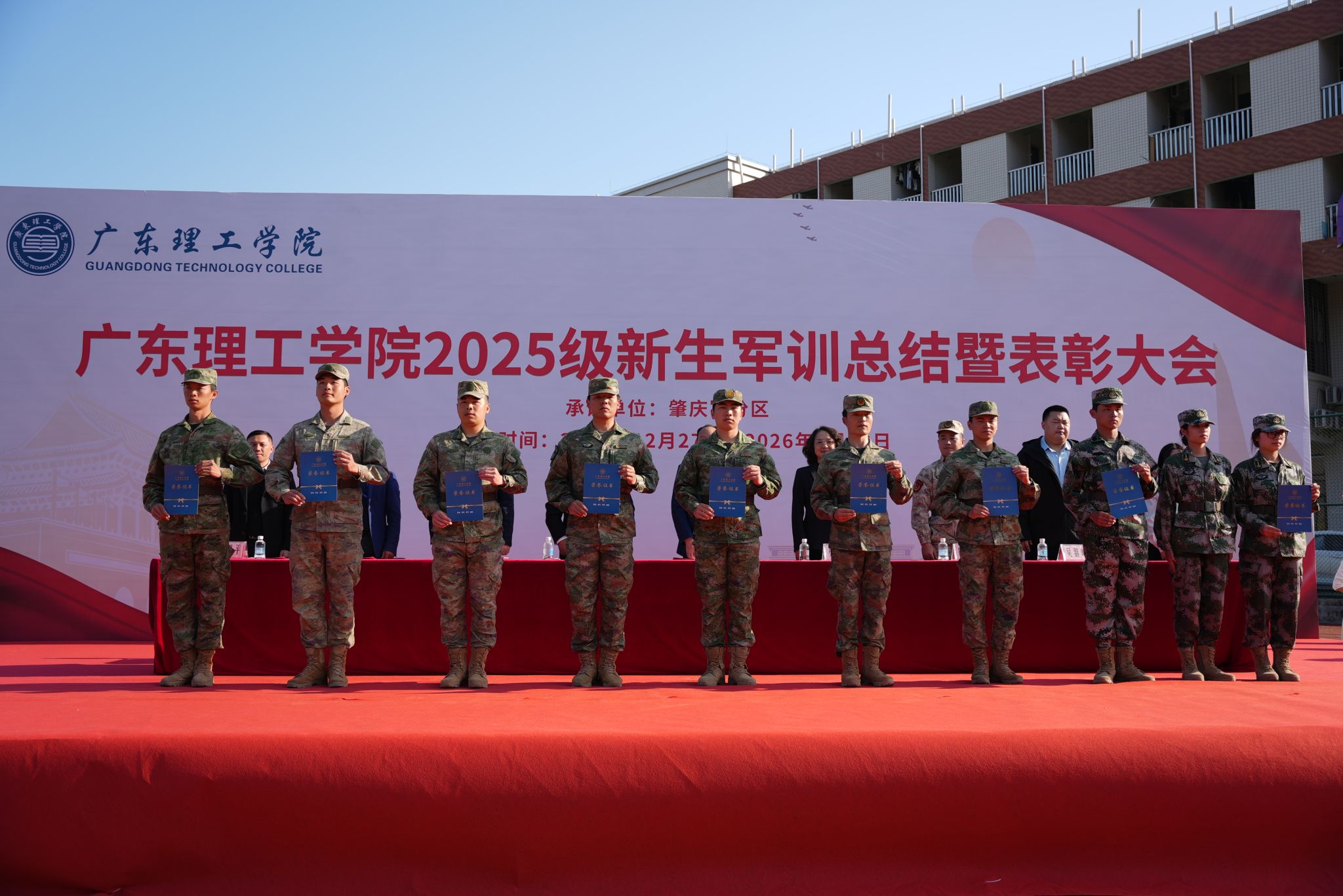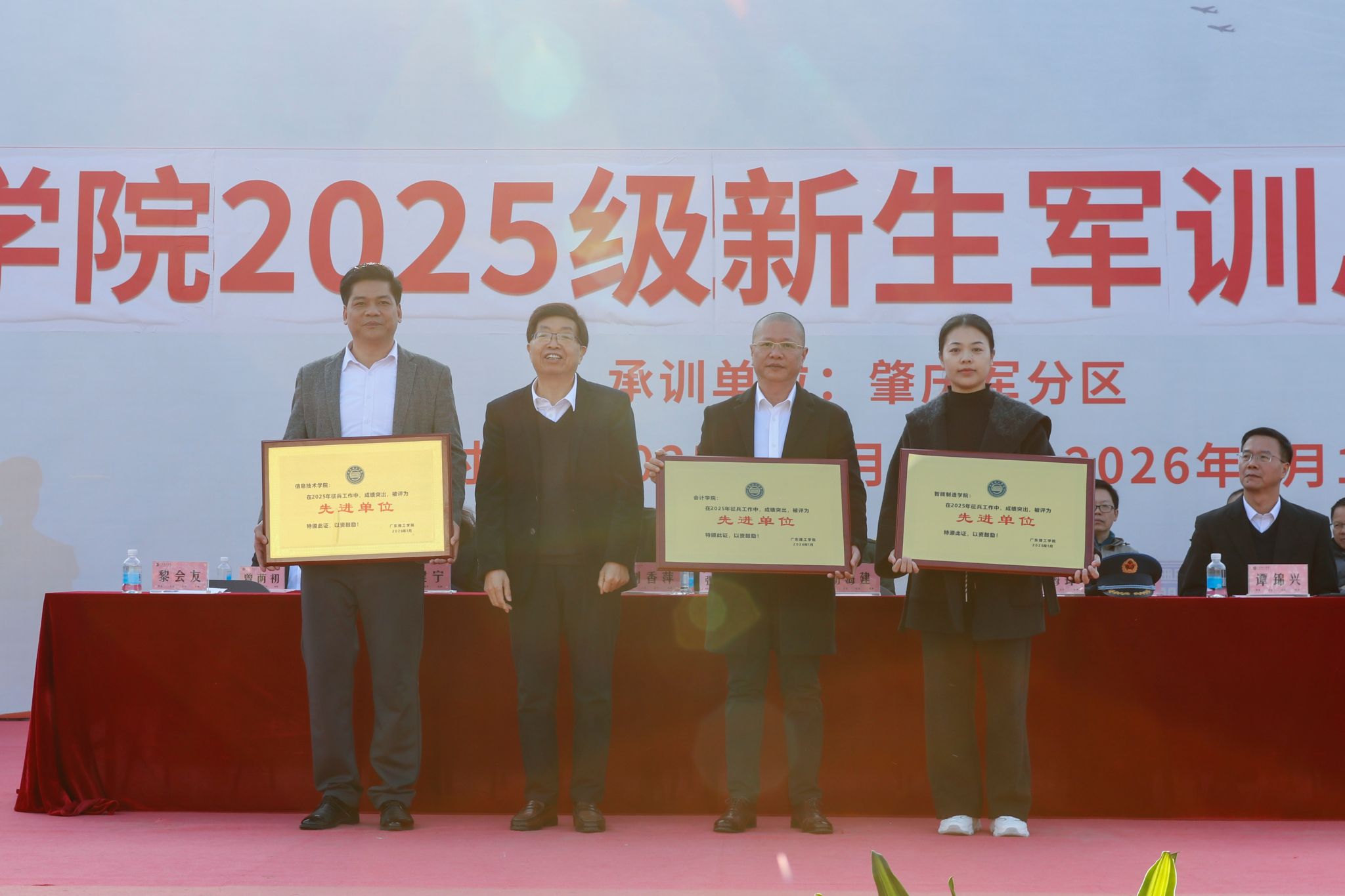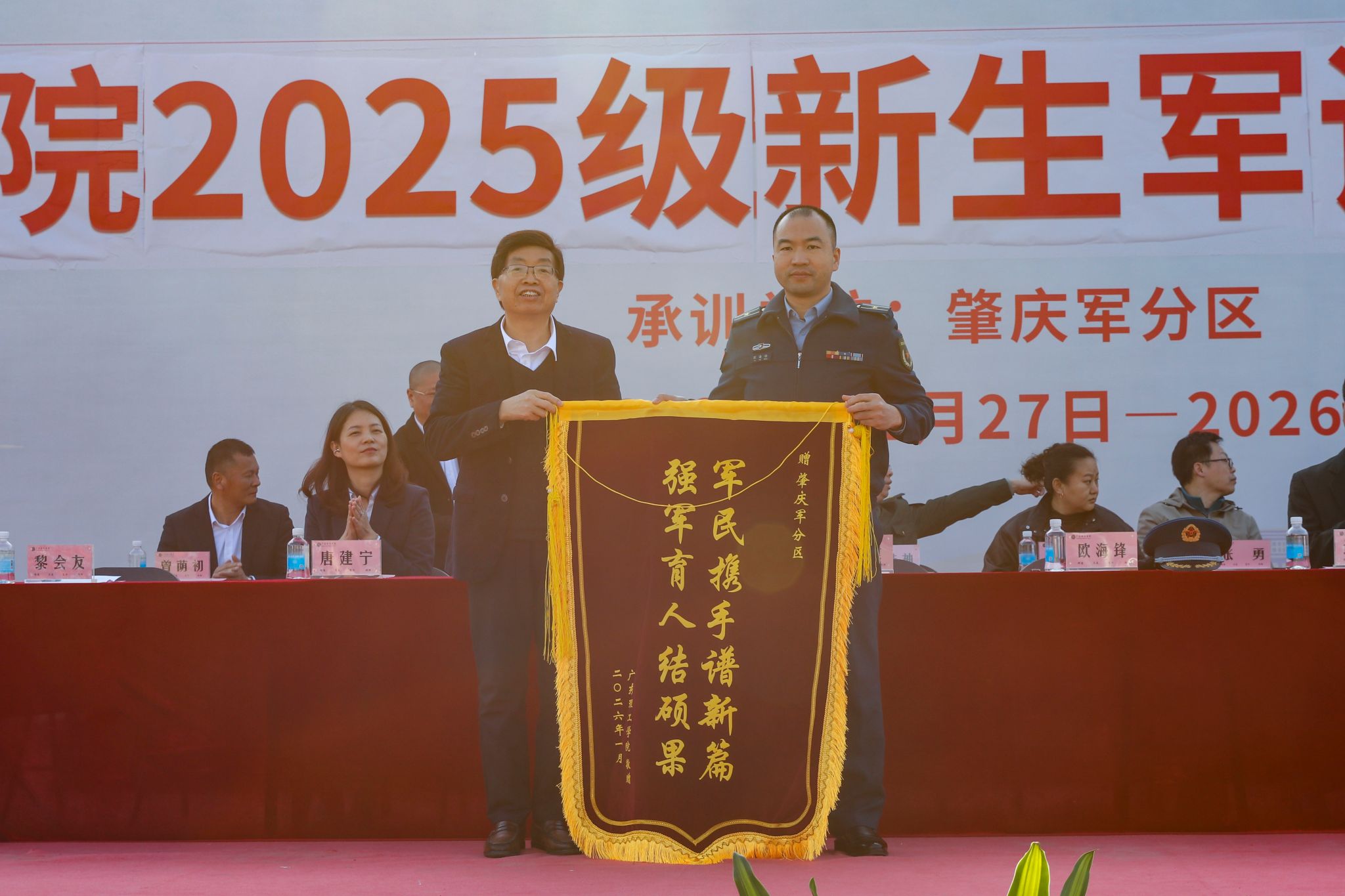 校党委副书记张宗珊、副校长谭锦兴分别宣读《关于表彰2025级学生军训优秀教官、先进集体和先进个人的决定》。参会领导为获奖代表颁奖。29名教官获评“军训优秀教官”,2025级本科机器人工程2班等20个班级荣获“军训先进集体”称号,354名同学被授予“军训先进个人”称号,20名同志获评“2025年度征兵工作先进个人”称号;智能制造学院、信息技术学院、会计学院获“2025年度征兵工作先进集体”称号,学校对以上先进集体与个人予以通报表彰。校党委书记胡海建代表学校向肇庆军分区赠送锦旗致谢。