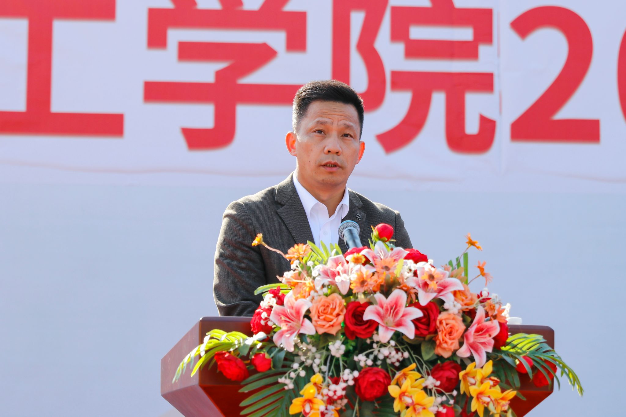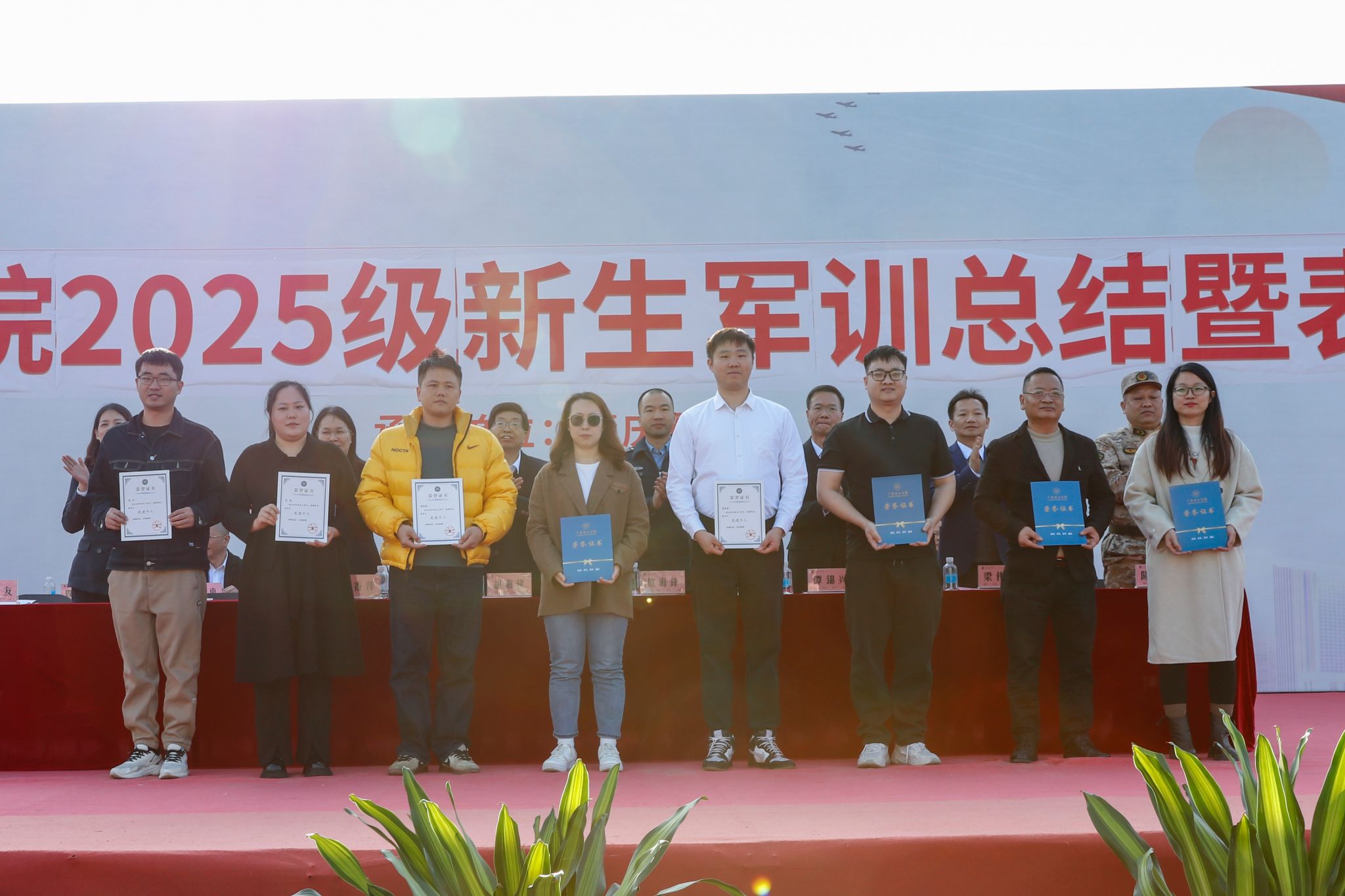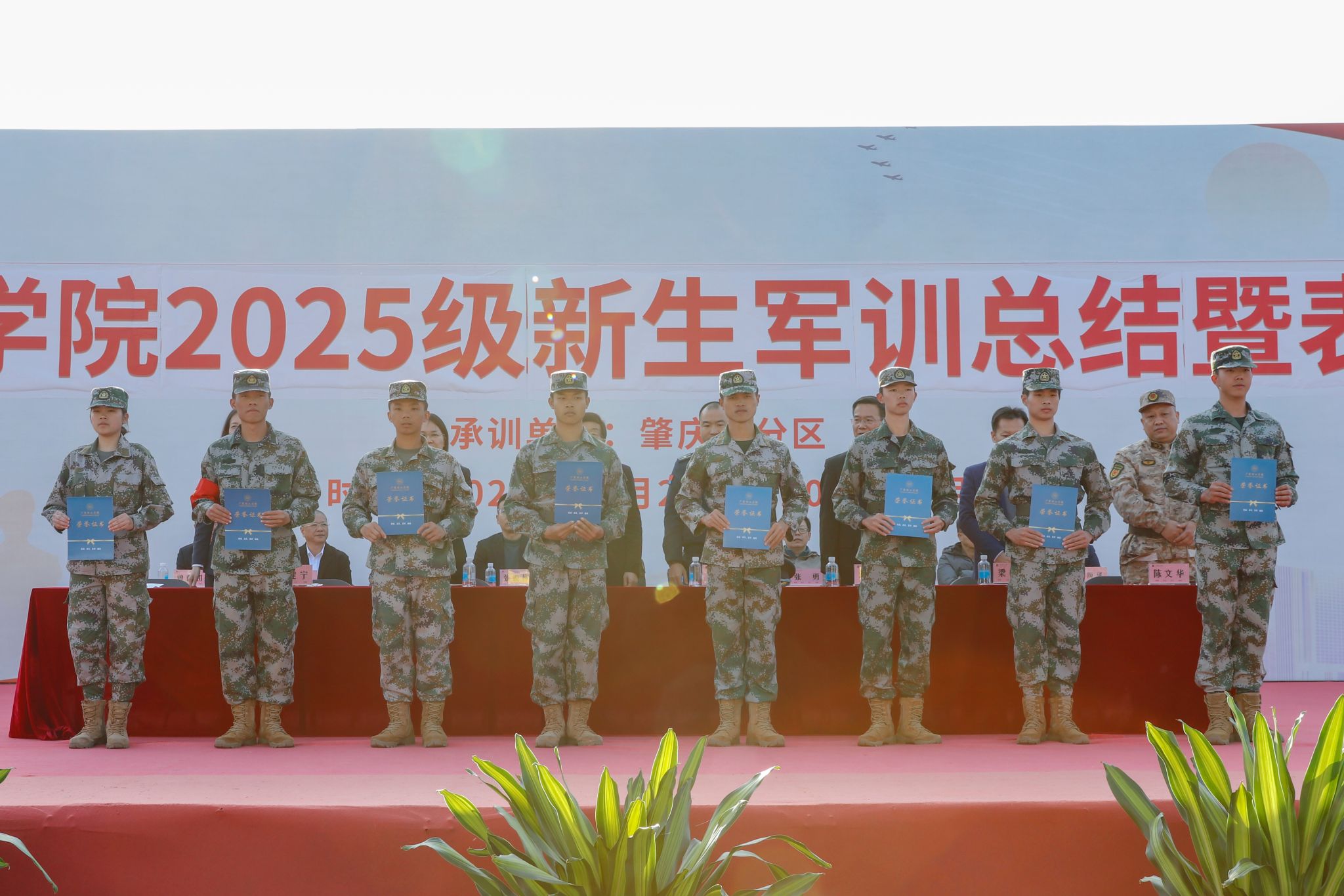 校党委副书记张宗珊、副校长谭锦兴分别宣读《关于表彰2025级学生军训优秀教官、先进集体和先进个人的决定》。参会领导为获奖代表颁奖。29名教官获评“军训优秀教官”,2025级本科机器人工程2班等20个班级荣获“军训先进集体”称号,354名同学被授予“军训先进个人”称号,20名同志获评“2025年度征兵工作先进个人”称号;智能制造学院、信息技术学院、会计学院获“2025年度征兵工作先进集体”称号,学校对以上先进集体与个人予以通报表彰。校党委书记胡海建代表学校向肇庆军分区赠送锦旗致谢。