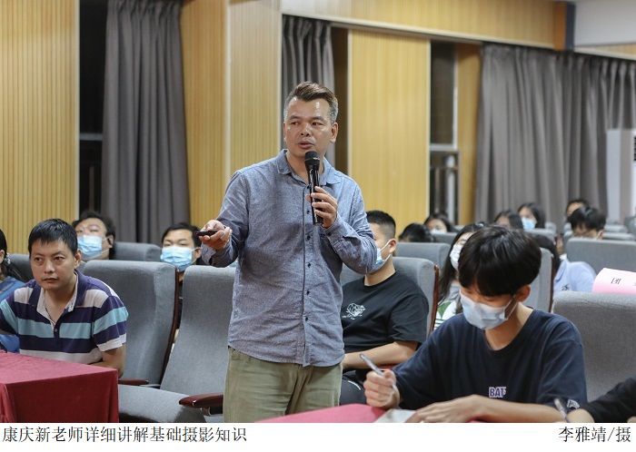 康庆新老师在讲座中从相机的功能和基本结构、摄影的构图方法、会议及大型活动拍摄技巧及注意事项等进行了专业介绍。他以大量的会议、活动、人物等方面的照片为实例,对摄影的取景构图、创作方法等进行了重点讲解。随后点评了摄影爱好者们上交的校园摄影作品,针对每一张照片,从构图、用光,到表现形式和内容进行一一讲解,并就现场师生提出的问题给予详细解答。