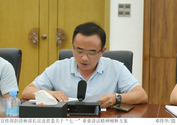 宣传部彭清林部长宣读省委关于“七一”重要讲话精神阐释方案。张东生书记指出,该方案不仅为各部门围绕习近平总书记“七一”重要讲话精神组织开展深入的理论研究和相关活动做出引导,也进一步强调学习“七一”重要讲话精神的重要意义。