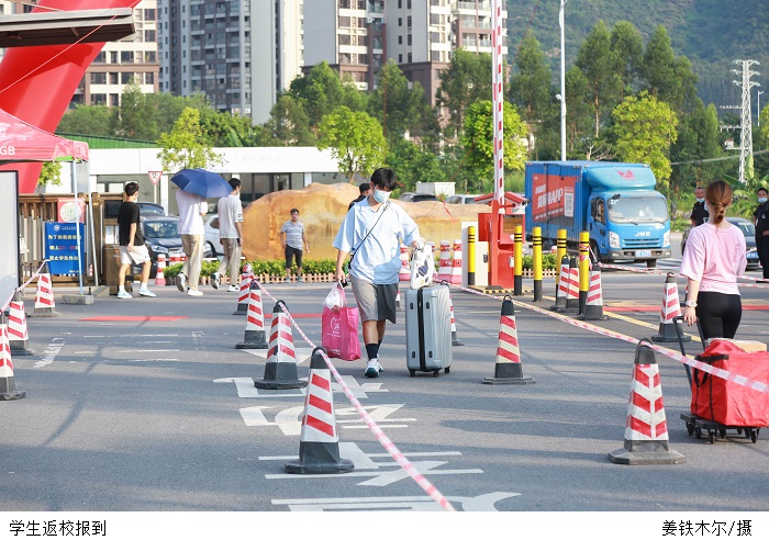 学生处李老师介绍,学校前期已经下发通知让返校学生注意相关事项,了解返校前、中、后期的各类情况,并由辅导员通知到位。安排人员对省外学生进行登记统计,保障他们安全及时地返校。报到时,派驻辅导员和志愿者轮班在校门口进行测温,查看“粤康码”、行程码等证明,确认无误后方可入校。校门口还配置了消毒人员进行消杀,进一步强化安全措施。因防疫要求,陪同人员不能入校,学校安排志愿者对返校学生进行协助,让学生们安心返校。