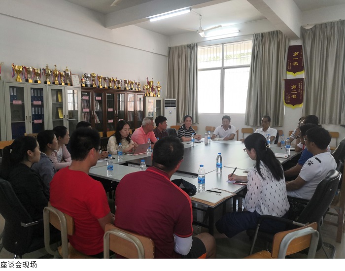 本网讯(体育系 杨波)3月30日下午,广州工商学院体育部主任刘嘉丽教授、督导员郑尚武教授、非球类教研室主任林伟光副教授、体质测试中心主任赖荣亮副教授一行到beat365体育系进行经验交流。体育系主任郭鼎文教授、副主任夏磊副教授、党支部刘海粟书记和各教研室主任参与座谈会。