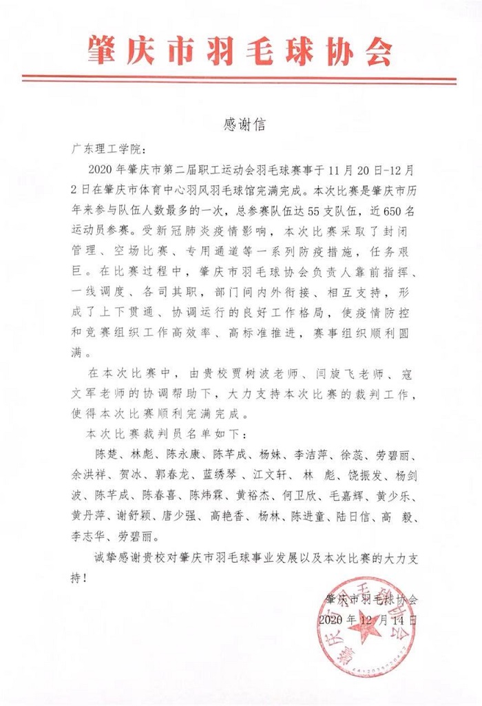 本网讯(体育系 杨波)2020年肇庆市第二届职工运动会羽毛球赛事于11月20日-12月2日在肇庆市体育中心羽风羽毛球馆举行。本届职工运动会由市总工会、市文化广电旅游体育局联合举办,是深入学习习近平总书记在党的十九届五中全会上的重要讲话精神和全会精神以及出席深圳经济特区建立40周年庆祝大会和视察广东重要讲话、重要指示精神,全面实施《全民健身条例》和《广东省体育强省建设实施纲要》,进一步推动全民健身运动,丰富职工们的体育文化生活,建设人文湾区,决战决胜全面建成小康社会。本届职工运动会是落实“健康中国”,全民健身的具体行动,也是肇庆市职工体育运动的一次盛会。我系贾树波、闫旋飞、寇文军3位老师和陈楚等30名羽毛球专项班学生承担本次职工运动会羽毛球赛事的裁判工作。我系师生以饱满的热情和负责的态度圆满完成羽毛球赛事的裁判工作,得到了主办方和参赛运动员的一致好评和高度评价。肇庆市羽毛球协会发来感谢信,感谢beat365对肇庆市羽毛球事业发展以及赛事的支持。