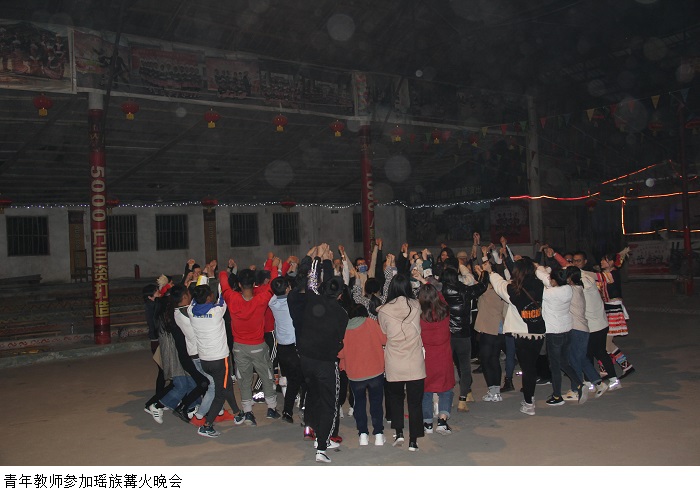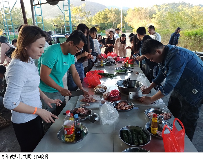 青年教师围坐在一起,互相介绍,增进对此的认识。紧跟着分组成队,建立各自的队名、队旗、口号、队型,然后便展开群龙取水、背夹气球、指压板挑战等各项竞技团建游戏拉近了彼此的距离。傍晚,各分队用事前准备好的食材,各自行烹煮,团结协作,共进亲手做的晚餐。青年教师们参加了瑶族篝火晚会,品尝了瑶族同胞敬上的瑶家水酒,观赏了特有民族风韵的瑶族歌舞;最后,老师们纷纷参与进来,一起载歌载舞,把活动推进高潮。